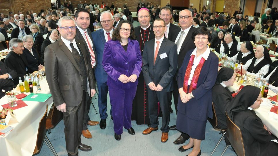 Das Bildungs- und Pflegeheim St. Martin ist eine Einrichtung der Ordensgemeinschaft "Kreuzschwestern von Straßburg", die im Jahr 2000 die "St. Hildegardishaus gGmbH, Jugend- und Behindertenhilfe, Düngenheim" als Träger für ihre sozialen Einrichtungen und Dienste gegründet haben. Schwerpunktaufgaben sind die Jugend- und Altenhilfe sowie die Hilfe für Menschen mit Beeinträchtigungen und jüngst auch die Flüchtlingshilfe. Mit mehr als 900 Beschäftigten - unter anderem an den Standorten Düngenheim und Ulmen - ist St. Martin auch einer der größten Arbeitgeber der Region. Zur Einrichtung gehört auch die Kaisersescher Kindertagesstätte "Haus für Kind und Familie", deren Kinder mit einem Lied und einem Tanz ein Ziel der Einrichtung - die Inklusion - mit zwei Worten auf den Punkt brachten: "Miteinander leben". Eine Beschreibung, die Bundesarbeitsministerin Andrea Nahles in ihrer Festansprache ebenfalls aufgriff. "Was wäre die UN-Behindertenrechtskonvention, ohne dass sie vor Ort gelebt wird - ein Stück Papier", so Nahles, die auch persönliche Beziehungen zur Einrichtung in ihre Festrede einbrachte - der Bruder ihrer Oma hat in St. Martin gearbeitet. Für sie ist das Engagement im Haus "segensreich", aber auch darüber hinaus: "Sozial im Glauben und offen für die Mitmenschen", sei St. Martin in Düngenheim. Foto: Pauly www.stmartin-dku.de