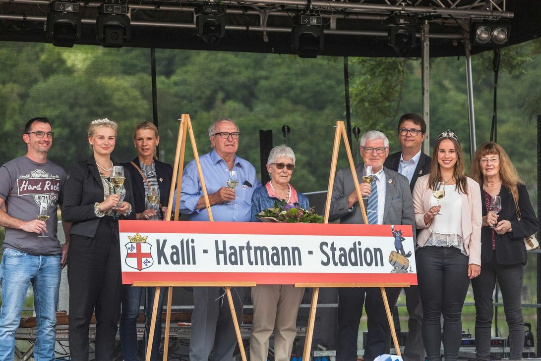 Seit Jahren organisiere Kalli Hartmann auch den Erfrischungsstand beim Weinfest. Viele andere Projekte habe er tatkräftig unterstützt - wie zum Beispiel das diesjährige Jumelage-Fußballturnier mit Nachwuchsteams aus den Partnerstädten. Beim Projekt "Wir für Zell" gehöre er zu den unersetzlichen Helfern und das mit 81 Jahren. "Sein Herz gehört dem Fußball und dem Moselstadion. Hier läuft nichts ohne Kalli Hartmann und das immer zum Wohle der Bevölkerung. Diesen Deinen Einsatz und Dein Engagement will der Stadtrat anerkennen und zollt Deiner Arbeit für die Allgemeinheit Respekt und Anerkennung. Daher beschloss der Stadtrat in seiner Sitzung am 28. Mai das Moselstadion in Kalli-Hartmann-Stadion umzubenennen. Kalli, die Zeller sind Stolz auf Dich", verteilte Hans Schwarz großes Lob. Zum Festakt waren auch zahlreiche Bürger aus Triptis der Heimatstadt von Hartmann angereist. "Damit hätte ich nicht gerechnet", so ein sichtlich gerührter Kalli Hartmann. Foto: Stadt Zell www.zell-mosel.com