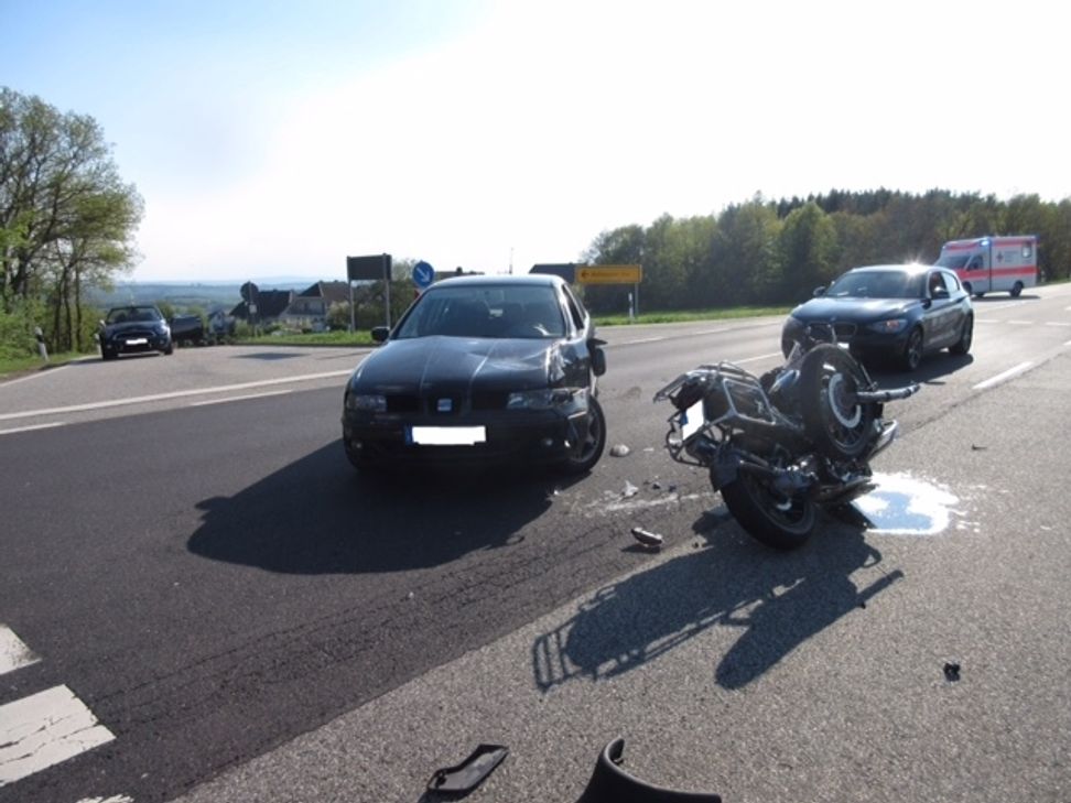 Nach bisherigen Ermittlungen der Polizei Zell übersah eine Pkw-Fahrerin, die aus Richtung Mosel kommende Motorradfahrerin vermutlich, als sie auf die B 421 auffahren wollten. Im Kreuzungsbereich kam es zum Frontalzusammenstoß. Durch die Heftigkeit des Aufpralles wurde die Motorradfahrerin mehrere Meter durch die Luft geschleudert. Nach notärztlicher Versorgung wurde sie umgehend in ein Krankenhaus transportiert. Durch den Unfall entstand an beiden Fahrzeugen ein Schaden in Höhe von rund 20.000 Euro. Die B 421 war eine Stunde gesperrt.