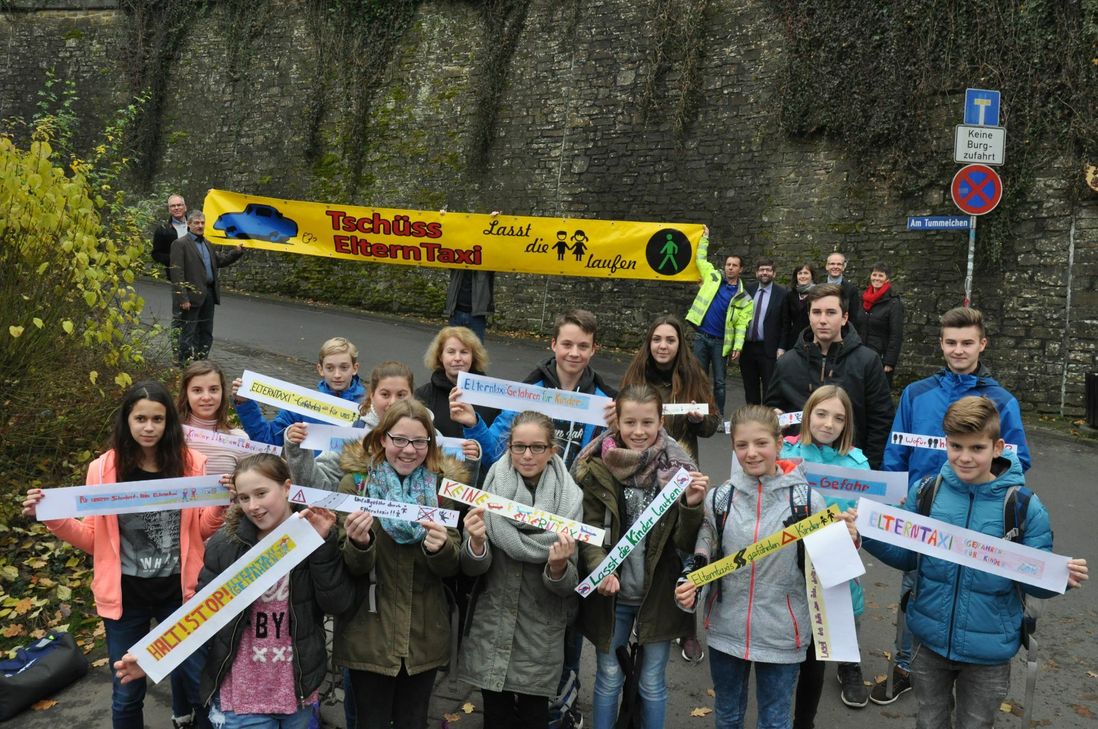 Was passiert, wenn morgens oder mittags ein Notfall am Schulzentrum in der Oberstadt den Einsatz von Rettungskräften notwendig macht? Im Zweifel bleiben die Einsatzfahrzeuge in einem Stau in der Straße "Am Tummelchen" stecken, denn je nach Tageszeit geht dort gar nichts mehr, wenn "Eltern-Taxis" die Straße verstopfen. "Bis Anfang 2016 gab es kein Notfallkonzept für den Schlossberg. Nach einem Runden Tisch von Kreis, Verbandsgemeinde, Stadt und den Schulen ist das zwar jetzt der Fall, aber die Verkehrsproblematik gibt es immer noch", erläutert Gero Meyer vom Schulelternbeirat des Gymnasiums, in der Hoffnung, dass die von den Schülerinnen und Schülern der 7c gestalteten Aktion gegen die "Eltern-Taxis" auf Resonanz trifft. Im Januar des Jahres wurden zwischen 6.45 und 7.45 Uhr insgesamt 250 an- und 150 abfahrende Pkw am Schulzentrum gezählt und das bei rund 1.300 Schülerinnen und Schülern, die das Martin-von-Cochem-Gymnasium und die Realschule plus besuchen. Eine Zahl, die zeigt, dass ein Notfall bei verstopfter Zufahrt prekär wäre. "Wir hoffen, dass die Eltern maximal bis zur Einmündung am ,Tummelchen‘ fahren. Damit wäre die Lage etwas entspannter", so Stadtbürgermeister Wolfgang Lambertz, der auch die Einsatzzeiten der Taxibusse, die an den Schulen vorbei zur Reichsburg fahren, weiter optimieren will. Zudem sei die Erneuerung der "Stadtwaldlinie" für ein Gesamtkonzept unverzichtbar. Foto: Pauly