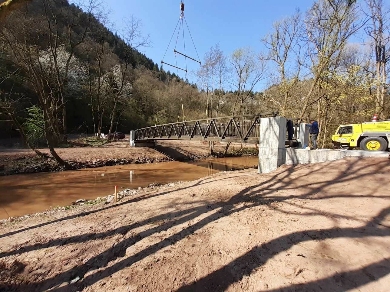 Das insgesamt nur 8,5 Tonnen schwere Aluminium-Bauwerk wurde im Werk in zwei Teilen vorgefertigt, auf der Baustelle zusammengesetzt und eingehoben. "Bei gleicher Tragfähigkeit hat Aluminium eine deutliche Gewichtsersparnis gegenüber Stahl. Im Werk können somit größere Bauteile vorgefertigt werden, wodurch die Qualität gesteigert wird im Vergleich zur kompletten Montage auf der Baustelle. Darüber hinaus ist eine Aluminiumbrücke korrosionsbeständig, ohne dass zusätzlicher Korrosionsschutz aufgebracht werden muss", so Bernd Cornely, Leiter des LBM Cochem-Koblenz, und der verantwortliche Projektingenieur Andreas Blümling. Nach dem Einhub werden noch Betonierarbeiten in geringem Umfang notwendig, so dass die Brücke künftig sicher mit den Unterbauten verankert ist. Ebenso werden im Umfeld des Bauwerks noch Zaunanlagen fertig gestellt, Restarbeiten ausgeführt und Rasenflächen eingesät. Nach derzeitigem Stand kann somit planmäßig Anfang Mai 2020 der Rad- und Gehweg von Alf bis nach Alf-Fabrik dem Rad- und Fußgängerverkehr übergeben werden. Bis der Lückenschluss des Rad- und Gehwegs von Alf bis zur Kreisgrenze fertiggestellt ist, sind noch zwei weitere Bauabschnitte erforderlich. Im nächsten Bauabschnitt erfolgt der Neubau des Rad- und Gehwegs von der Kreisgrenze bis zum Anschluss an die B 49 zwischen Alf-Fabrik und Höllenthal; etwa auf hälftiger Wegstrecke zwischen Alf- Fabrik und Höllenthal. Dieser Abschnitt wird Mitte der zweiten Jahreshälfte 2020 begonnen. Der Lückenschluss des Rad- und Gehwegs zwischen Alf-Fabrik und Höllenthal kann aufgrund von derzeit laufenden Baumaßnahmen des LBM Trier erst ab der zweiten Jahreshälfte 2021 angegangen werden, da hierzu auch die B 49 von Alf-Fabrik bis Höllenthal zeitweise voll gesperrt werden muss. Derzeit würden die benötigten Umleitungsstrecken mit den Baumaßnahmen des LBM Trier kollidieren. Im Zuge des Lückenschlusses des Rad- und Gehweg werden zudem auch noch Instandsetzungsarbeiten an der B 49 von Alf bis Alf-Fabrik mit ausgeführt. Foto: LBM Cochem-Koblenz www.lbm.rlp.de