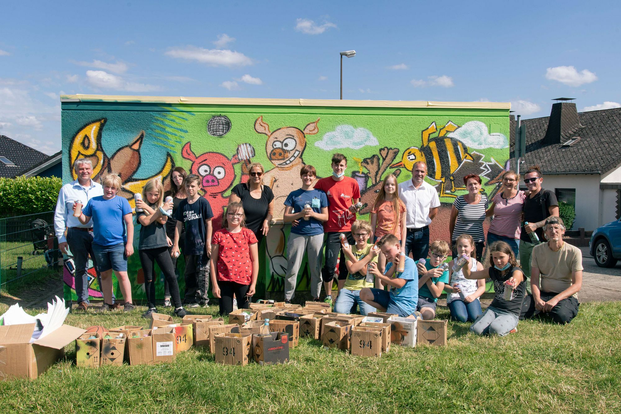 Neben dem Spielplatz am Tannenweg in Kaisersesch stand eine triste, graue Trafostation. Jetzt verwandelte sich die Station unter Anleitung der Jugendkunstschule (JUKUSCH) Cochem-Zell in einen echten Hingucker. Seit Jahren kooperiert die JUKUSCH erfolgreich mit der Kreisjugendpflege Cochem-Zell. Neben einer gemeinsamen Kunstwoche gibt es seit vielen Jahren Graffiti-Projekte. Zusammen mit dem Künstler Arne Witt entstanden zunächst die Entwürfe in der JUKUSCH in Klotten. Dann ging es los mit Graffiti-Übungen, erst auf einer Folie, später auf der Wand. Elf Jugendliche realisierten schließlich ihre farbenfrohen Entwürfe: einen Hirsch, eine Katze, verschiedene Vögel, ein riesiges Krokodil, einen Affen, Fische im kleinen Fluss, riesige Pilze am Wegesrand, Schmetterlinge und zwei "Partyschweine". Ein Dank der Künstler ging an Stadtbürgermeister Gerhard Weber. Er sorgte für die Grundierung – den grünen Wiesengrund auf der Trafostation – und am Aktionstag grillte er dann persönlich für die ganze Gruppe. Foto: privat www.jukusch.org