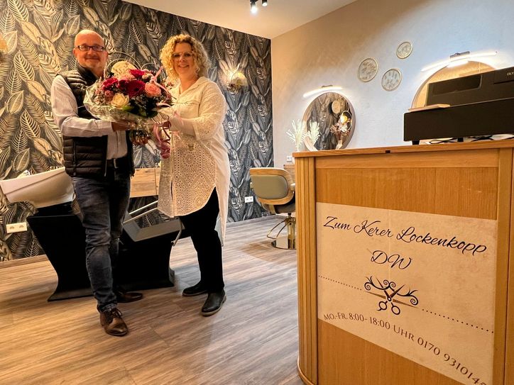 Die Freude ist groß bei Dunja Weiß in Moselkern, die Friseurmeisterin eröffnete am Montag, 25.03.24 ihren eigenen Friseursalon in der Oberstraße 10 in Moselkern. „Zum Kerer Lockenkopp DW“ – so bezeichnet Sie ihr Geschäft in der Oberstraße 10, 56254 Moselkern und verdeutlicht damit ihre Verbundenheit zu ihrem Heimatort. Der Salon, der im eigenen Haus im Erdgeschoß eingerichtet wurde, ist gut erreichbar, auch per Bahn. Der Bahnhof und die Bushaltestelle „Seilerstraße“ sind nur wenige Meter entfernt. Der Salon wird montags – freitags von 08:00 – 18:00 Uhr geöffnet, Termine können gerne telefonisch unter 0170/93 10 145 vereinbart werden. Mit Ihr freut sich Ortsbürgermeister Peter Mayer und überreicht ihr aus Anlass der Neugründung einen großen Blumenstrauß mit den besten Wünschen für einen erfolgreichen Start in die Selbständigkeit. „Jeder neue Betrieb in unserem Dorf ist eine Bereicherung für unser Dorf, verbessert er doch das Angebot für Einwohner, Gäste und Besucher.“ Auch Firmeninhaberin Dunja Weiß ist überzeugt: „Ein Besuch beim Friseur ist mehr als Haare schneiden, es ist Wellness für Haare und Geist“! Nach einem Besuch beim „Kerer Lockenkopp DW“ werden sicher alle aus Moselkern und Umgebung frisch gestylt das Osterfest feiern und in den Frühling starten können.