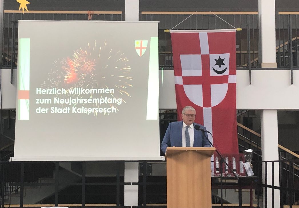 Stadtbürgermeister Gerhard Weber begrüßt zur Stunde zahlreiche Bürger, Gewerbetreibende und Ehrengäste wie Marlon Böhr, Anke Beilstein, Benedikt Oster und Thomas Welter zum Neujahrsempfang in der Pommerbachschule in Kaisersesch. Der Stadtbürgermeister bedankte sich für die gute Zusammenarbeit und gab Einblick in den Fortschritt der Baumaßnahmen im neuen Bau - und Gewerbegebiet, gratulierte der Feuerwehr nochmal zum 100-jährigen Jubiläum sowie der Firma Reuter zum 90. und der Firma Oster - Daum zum 70. jährigen Bestehen. Er gab auch bekannt, das er sich zur Wahl als Stadtbürgermeister wieder aufstellen lässt. Ausführlicher Bericht im Wochenspiegel folgt.
