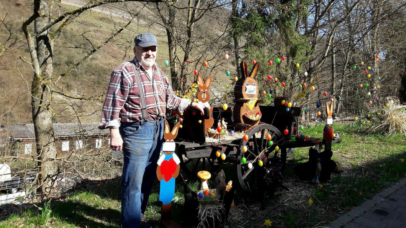Hans Jobst präsentiert rund um Weihnachten beispielsweise eine Krippenlandschaft und jetzt zur Osterzeit selbst geschnitzte Osterhasen in einem bunten Eiermeer. "Wir alle danken unserem Senior ganz herzlich", freuen sich seine Nachbarn über Jobsts kreative Ideen. Foto: privat