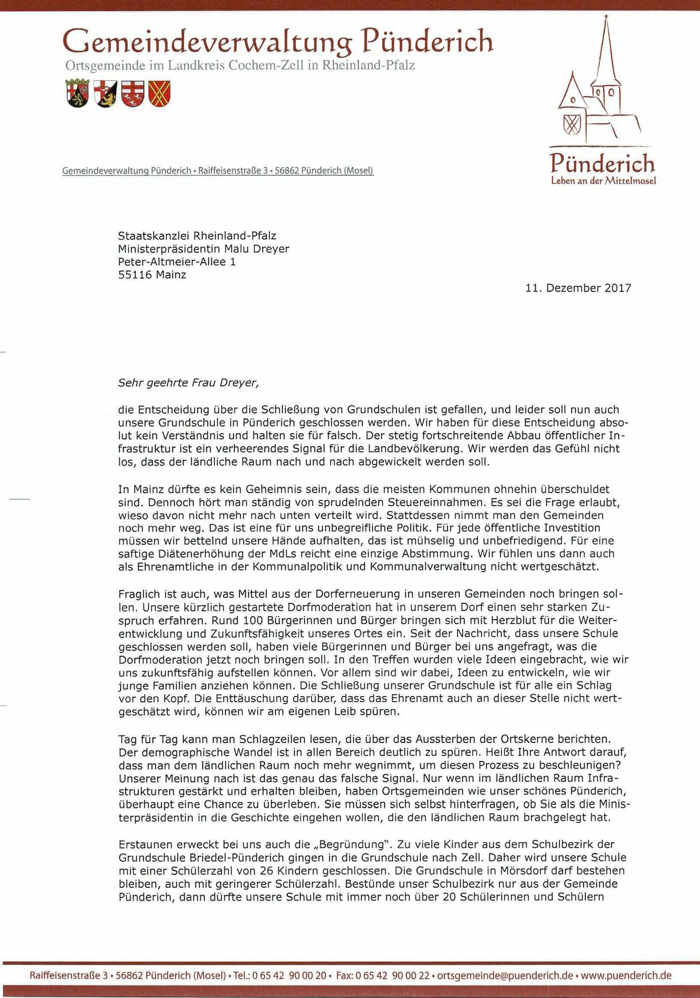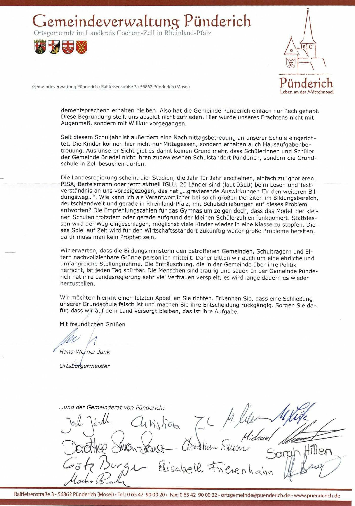 Die Pündericher betonen in ihrem Schreiben, dass sie absolut kein Verständnis für die Schulschließung haben. "Der stetig fortschreitende Abbau öffentlicher Infrastruktur ist ein verheerendes Signal für die Landbevölkerung. Wir werden das Gefühl nicht los, dass der ländliche Raum nach und nach abgewickelt werden soll", feißt es in dem an die Ministerpräsidentin adressierten Schreiben. Alleine aus Pünderich besuchten mehr als 20 Schülerinnen und Schüler die Grundschule im Ort. Aus dem Schulbezirk Briedel-Pünderich seien es zurzeit 26. "Die Grundschule in Mörsdorf darf bestehen bleiben, auch mit geringerer Schülerzahl", wird in dem Schreiben angeführt. Ein weiterer Kritikpunkt ist die Informationspolitik: "Wir erwarten, dass die Bildungsministerin den betroffenen Gemeinden, Schulträgern und Eltern nachvollziehbare Gründe persönlich mitteilt." Foto: privat