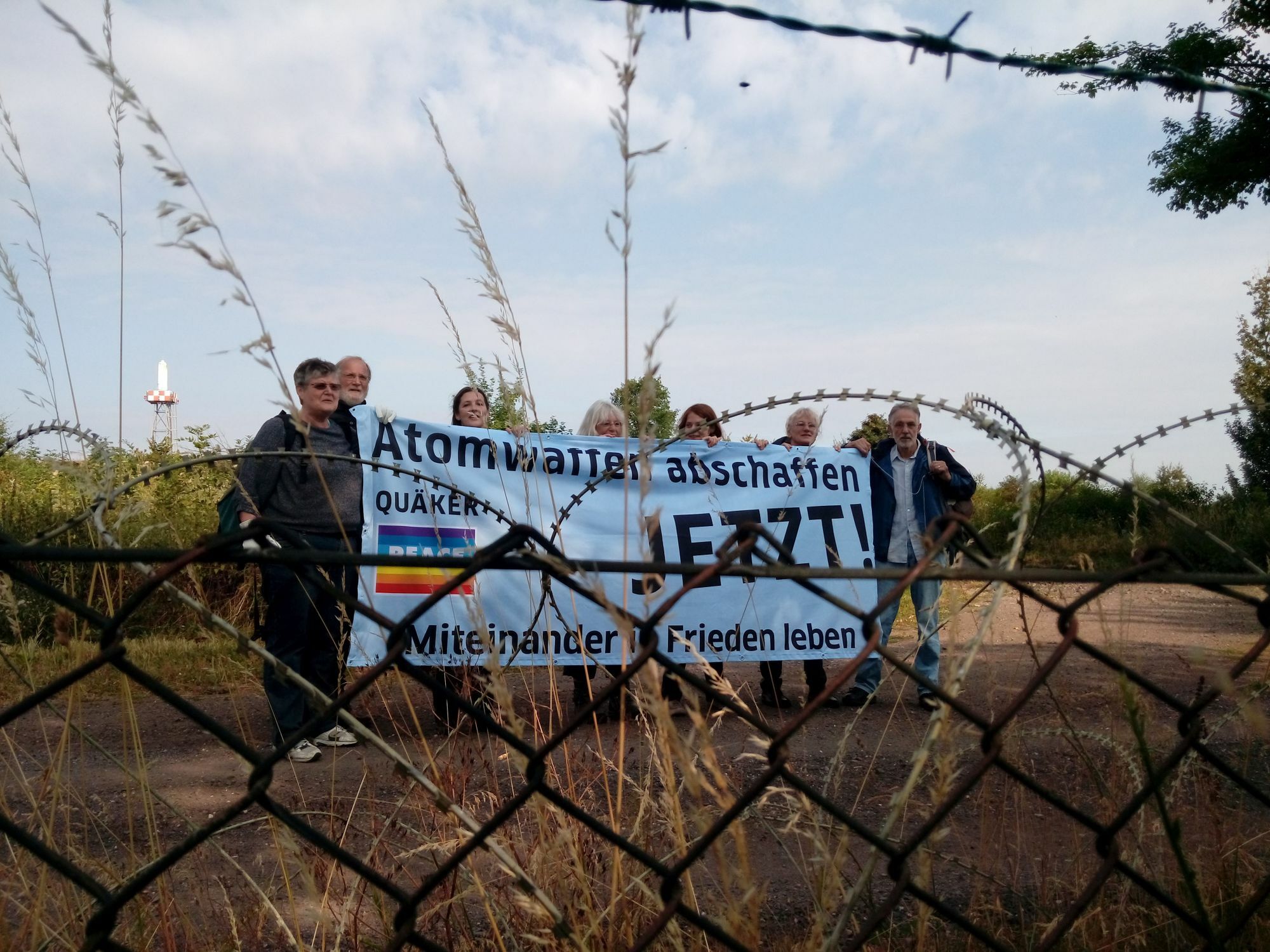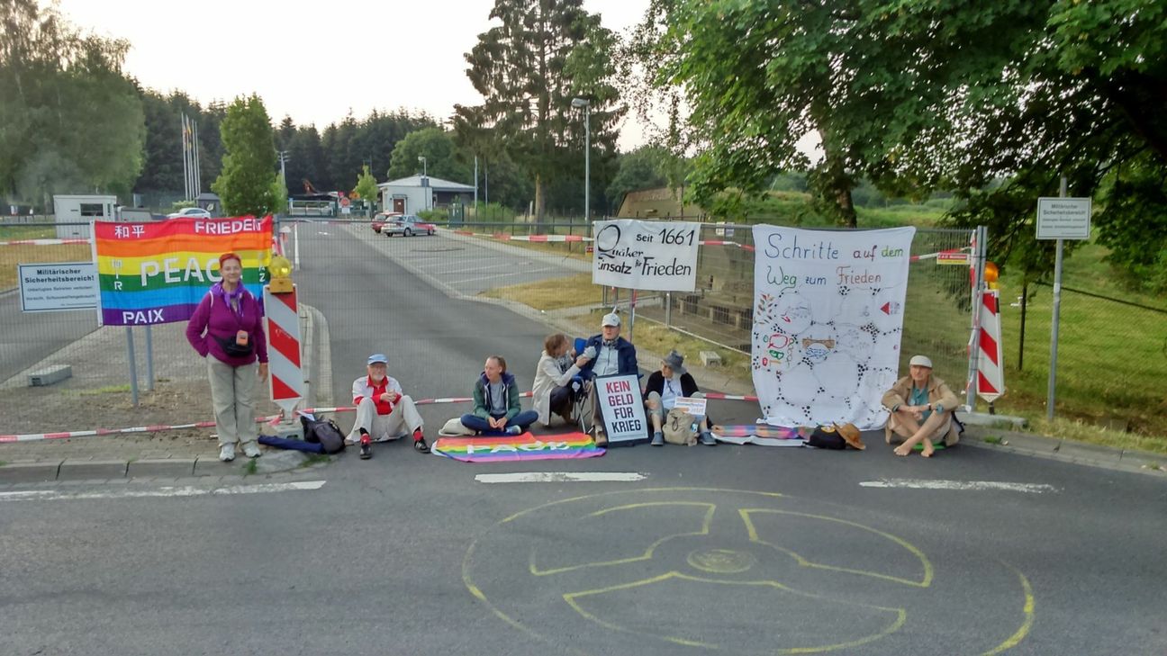 Dort sangen und musizierten sie mit Akkordeon und Flöte, streuten Blumensamen. Sie rechtfertigen ihre Aktion damit, dass die Bundesregierung untätig bleibt, denn: "Das Üben mit Atomwaffen ist illegal, da es gegen Völkerrecht verstößt." Früher am Morgen fand vor dem Haupttor des Fliegerhorsts eine gewaltfreie Sitzblockade statt. Auf Bannern erklärten die Quäker: "Atomwaffen abschaffen JETZT" und "Miteinander in Frieden leben". Die Demonstranten gehören zu den Quäkern, einer freien Religionsgemeinschaft, in der das Friedenszeugnis, so heißt es in einer Pressemitteilung, ein zentraler Bestandteil sei. Verstärkt wurden sie vom Netzwerk Friedenssteuer und Pax Christi.