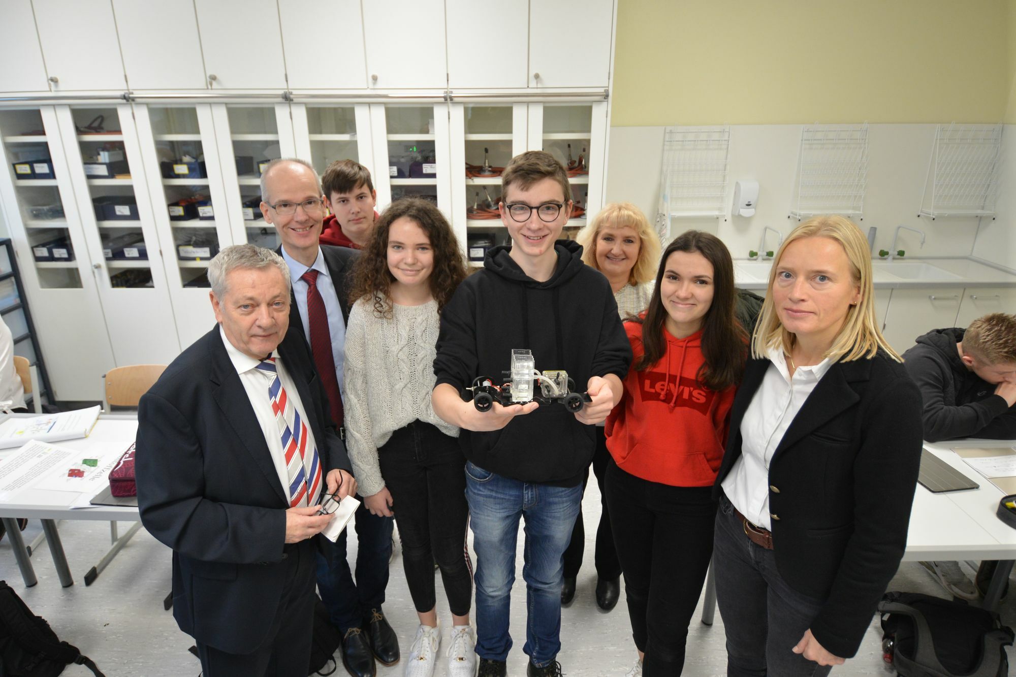 Von Mario Zender Insgesamt 3,6 Millionen Euro wurden für die energetische Sanierung des Gebäudes, den Brandschutz und die Erneuerungen der Klassenräume ausgegeben. Und das Ergebnis kann sich sehen lassen, obwohl noch nicht alle Maßnahmen abgeschlossen sind. Das meinte auch Landrat Manfred Schnur, der sich heute den neuen Chemieraum anschaute. Die 9. Klasse demonstrierte dem Kreischef wie innovativ sie während ihres Unterrichts experimentieren können, etwa zum Thema Wasserstoff, durch den bei einem Versuch ein Modellauto angetrieben wurde. Schüler Janus Schifferdecker, 14 Jahre, aus Büchel erläutert Schnur das Experiment: „Durch Licht wird Energie hergestellt und die wird in eine Brennstoffzelle weitergeleitet. Durch die Brennstoffzelle wird einmal Wasserstoff und Sauerstoff hergestellt und schließlich Energie hergestellt, die an das Auto weitergeben wird. Als Abfallprodukt haben wir lediglich Wasser.“ Landrat Manfred Schnur: „Neben einem guten baulichen Zustand unser Schulen, auch energetisch, ist unser großes Augenmerk auch im Inneren der Schule auf den Bereich der Naturwissenschaften mit guten Räumen die Chance zu geben, Begeisterung für die Naturwissenschaften zu wecken. Ein Bereich den wir in unserer Gesellschaft brauchen. Aber, wie wir hier auch sehen konnten, mit dem Thema Wasserstoff und Brennstoffzellen sich einem Bereich widmen, der für uns die Zukunft darstellt, Und ich glaube das ist auch eine große Anerkennung für unsere Schule und die Lehrkräfte, dass sie sich diesem Thema so stellen und den Kindern versuchen Freude an dem Fach, aber auch gutes Wissen für die Zukunft vermitteln.“ Ideale Voraussetzungen also für die 660 Schüler, die an der Realschule plus und der Gemeinsamen Orientierungsstufe mit dem Gymnasium hier von 45 Lehrerinnen und Lehrern unterrichtet werden. Das sorgt auch bei den Lehrern für Zufriedenheit, wie Vera Feiden berichtet. „Als Fachlehrerin bin ich sehr froh, dass wir diese Möglichkeiten erhalten. Um Experimente am Platz durchführen zu können, haben wir mit dem neuen System eine sehr flexible Lösung bekommen, die seines Gleichen sucht“. Und nicht nur Chemieexperimente wurden von den Schülern heute demonstriert, sondern auch ein Projekt vorgestellt, bei dem es um das Schiff „Polarstern“ geht, das die Auswirkungen des Klimawandels am Nordpol erforscht. Auch dies faszinierte Landrat Schnur, der sich bereits seit vielen Jahren mit innovativen Projekten für unser Klima einsetzt. Schnur: „Es dreht sich alles um den Ersatz fossiler Brennstoffe und dem Erzeugen von CO2-Feinstaub, um möglicherweise die Klimaerwärmung zu stoppen. Wir müssen was tun“. Die großen Investitionen sorgen auch beim Schulleiter Christian Etzkorn für Zufriedenheit: „Wir freuen uns sehr, dass der Kreis hier in den letzten Jahren große Summen investiert hat, um einen moderne und zukunftsorientierten Unterricht anbieten zu können. Insbesondere in Bereich der Naturwissenschaften wurden jetzt alles auf den neusten Stand gebracht. Wir sind also wirklich auf einen Schlag ins 21. Jahrhundert katapultiert worden“. Video: Zender