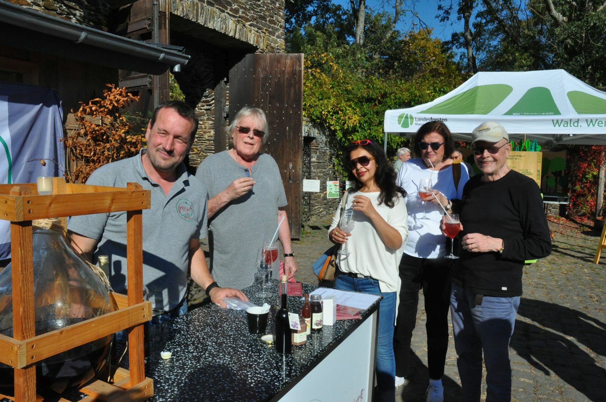 Der Klang der Jagdhornbläsergruppe "Wilde Endert" hat im Elztal von der zweiten Auflage der Veranstaltung "Wild" auf Burg Pyrmont gekündet. Das Thema war beispielhaft gewählt, um zum einen Wild und Wald in den Fokus zu rücken und zum anderen regionale Produkte ins Freiluft-Schaufenster zu stellen. "Alles passt", war Albert Jung, Bürgermeister der ausrichtenden Verbandsgemeinde Kaisersesch, zufrieden. Dabei setzte der Chef des Schieferlands auf regionale Anbieter, die ein starkes Stück Lebensart verkörpern. Allerdings ist der Bekanntheitsgrad - je nach Produkt - sehr unterschiedlich. Während Andrea Weber vom Nellehof in Kaisersesch mit ihren Freiland-Eiern bereits einen großen Kundenstamm hat, müssen andere ihre Angebote erst unters Volk bringen. "Wir setzen aufs Probieren", sagt Metzgermeister Stefan Wiersch, der Widschwein-Wurst und -Schinken anbietet. Und für Stefanie Peifer und Martina Theobald aus Alflen gilt es beispielsweise Aronia bekannt zu machen. Und wer einfach nur den Sommertag im Herbst genießen wollte, der war an diesem Tag auf Burg Pyrmont auch richtig. Fotos: Pauly www.burg-pyrmont.de www.schieferland-kaisersesch.de