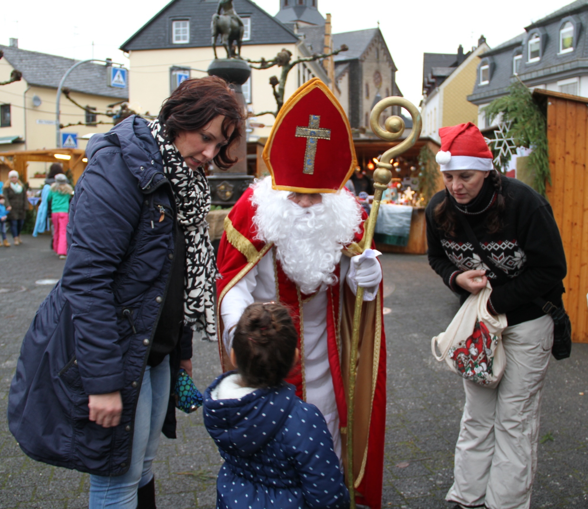 In den kurzen Regenpausen wandte sich dann aber doch noch alles zum Guten und der Weihnachtsmarkt bot ein stimmungsvolles Bild. Als der Nikolaus die Kinder überraschte, bekam auch sein Geselle Knecht Ruprecht eine neue Aufgabe: Er hielt den Schirm für den vorweihnachtlichen Besucher, der sicherlich eher Schnee gewohnt ist. Foto: Klasen