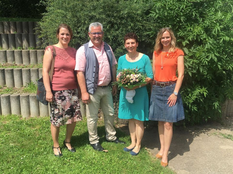 Die Lehrerin wird für ein Jahr Schülerinnen und Schüler in einer französischen Grundschule im Fach Deutsch unterrichten. Anja Schenk (von links, Elternbeirat), VG-Bürgermeister Albert Jung, und Sandra Klinkner (Elternbeirat) dankten der engagierten Pädagogin. Foto: VG Kaisersesch www.gs-brohl.de