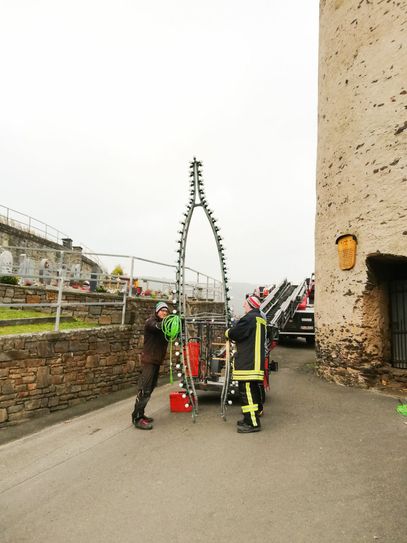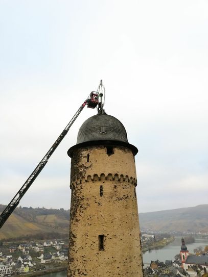 Unterstützt vom städtischen Bauhof und der Freiwilligen Feuerwehr der Stadt Zell erklommen die Dachdecker der Firma Eiserloh und Mesenich aus Zell das Dach des Turms und befestigten die Spezialkonstruktion, die den Runden Turm alljährlich in eine überdimensionale Kerze verwandelt. Fotos: Stadt Zell www.zell-mosel.com