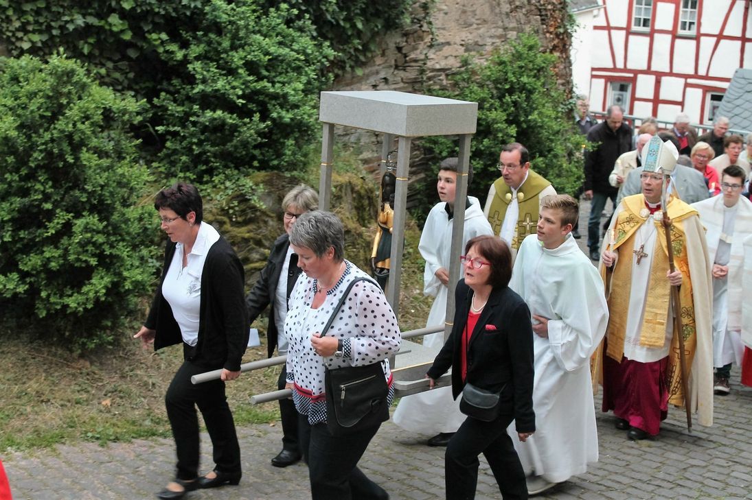 Die diesjährige 30. Wallfahrt hat auch der Trierer Bischof Dr. Stephan Ackermann begleitet. »Das Besondere an dieser Wallfahrt, ist, dass man nicht zu Maria hin pilgert, sondern dass mit Maria gepilgert wird«, betonte der Bischof. Traditionell tragen Hunderte Pilger das Gnadenbild auf einer Sänfte hinunter zum Fluss auf das Schiff "Wappen von Cochem", um die Gottesmutter während der Fahrt auf der Mosel zu verehren. Die aus dem 12. oder 13. Jahrhundert stammende Figur wurde vermutlich um 1620 von spanischen Eroberern nach Beilstein gebracht und gehört seitdem zum Erbe der Moselgemeinde. Die Schwarze Madonna gilt als ältestes Marienbild der Region und wird in der ehemaligen Karmeliterkirche, der heutigen Pfarrkirche St. Joseph, verwahrt. Foto: Bistum Trier www.beilstein-mosel.de