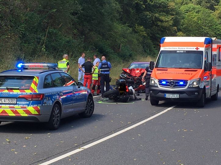 Schwerer Motorradunfall soeben auf der Bundesstraße 259 zwischen Cochem und Faid (Panoramastraße): Ein englischer Motorradfahrer war aus bislang ungeklärter Ursache nach links auf die Gegenfahrbahn geraten und dort frontal mit einem PKW zusammengestoßen. Der Motorradfahrer verstarb noch an der Unfallstelle, zwei Insassen des PKW wurden leicht verletzt. Die Panoramastraße ist derzeit noch voll gesperrt, ein Rettungshubschrauber ist im Einsatz.  Foto Zender