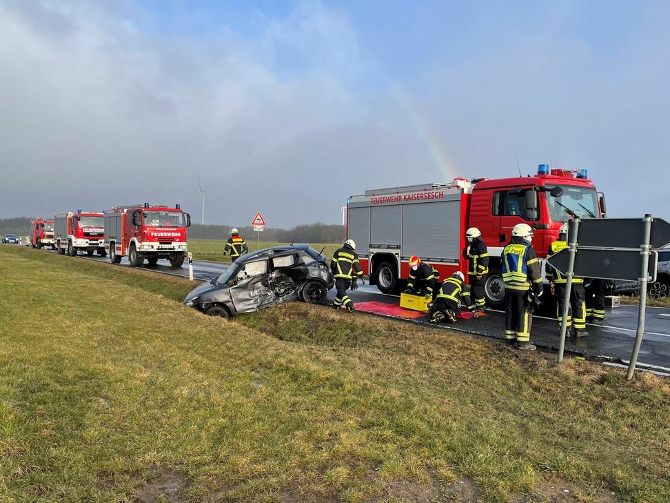 Im Bereich der Einmündung aus Richtung Dünfus sind zwei Fahrzeuge zusammengestoßen. Ein schwer verletzter Fahrer musste von Einsatzkräften der Freiwilligen Feuerwehr aus seinem Auto befreit werden. Neben dem Rettungsdienst war auch der Rettungshubschrauber vor Ort. Die L 108 musste gesperrt werden. Foto: Zender