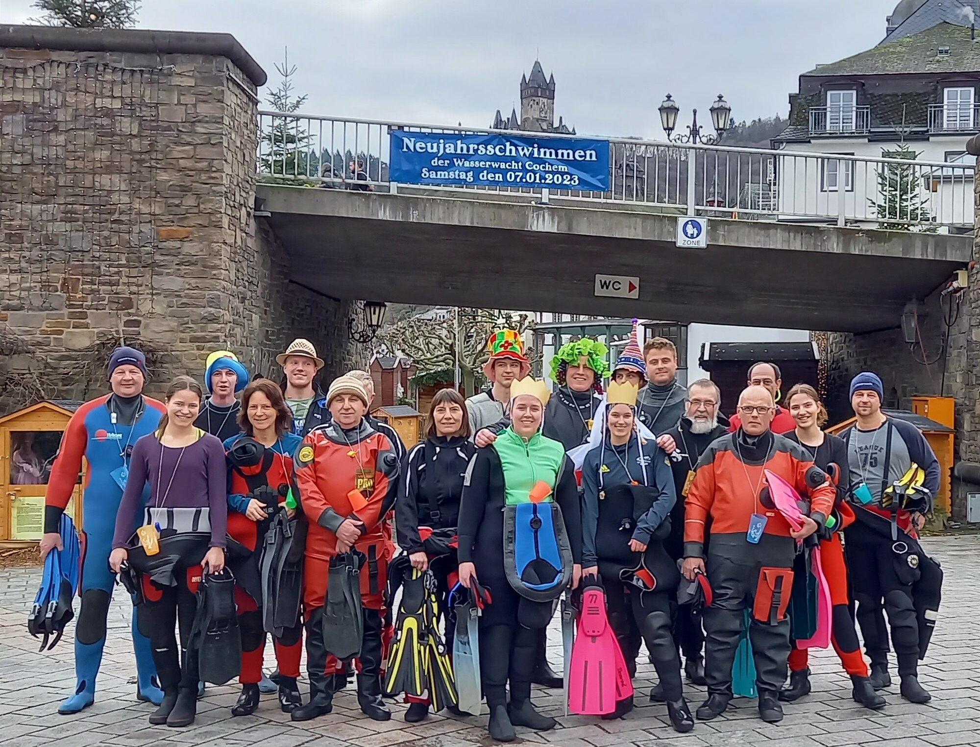 Cochem. Nach zwei Jahren Corona-Pause haben sich 24 wagemutige Frauen und Männer in Ernst in die Fluten der Mosel gestürzt, um beim 33. Neujahrsschwimmen der DRK-Wasserwacht Cochem – unter einem Neoprenanzug – »hautnah« dabei zu sein. Unter den Schwimmerinnen waren in diesem Jahr auch die amtierenden Cochemer Weinmajestäten Lisa und Tamara. Begleitet wurde die bunte Truppe von Booten des THW Cochem, der Freiwilligen Feuerwehr Cochem und befreundete Wasserwachten aus Trier und Römerberg sowie der Wasserschutzpolizei. Nach gut einer Stunde kamen alle Schwimmer am Ziel an der Mündung des Enertbachs an, wo sie von vielen Zuschauerinnen und Zuschauern mit Beifall empfangen wurden. Zunächst durch die Köche des DRK Cochem mit einer Suppe versorgt, ging der Nachmittag für alle noch mit Kaffee und Kuchen gemütlich zu Ende.