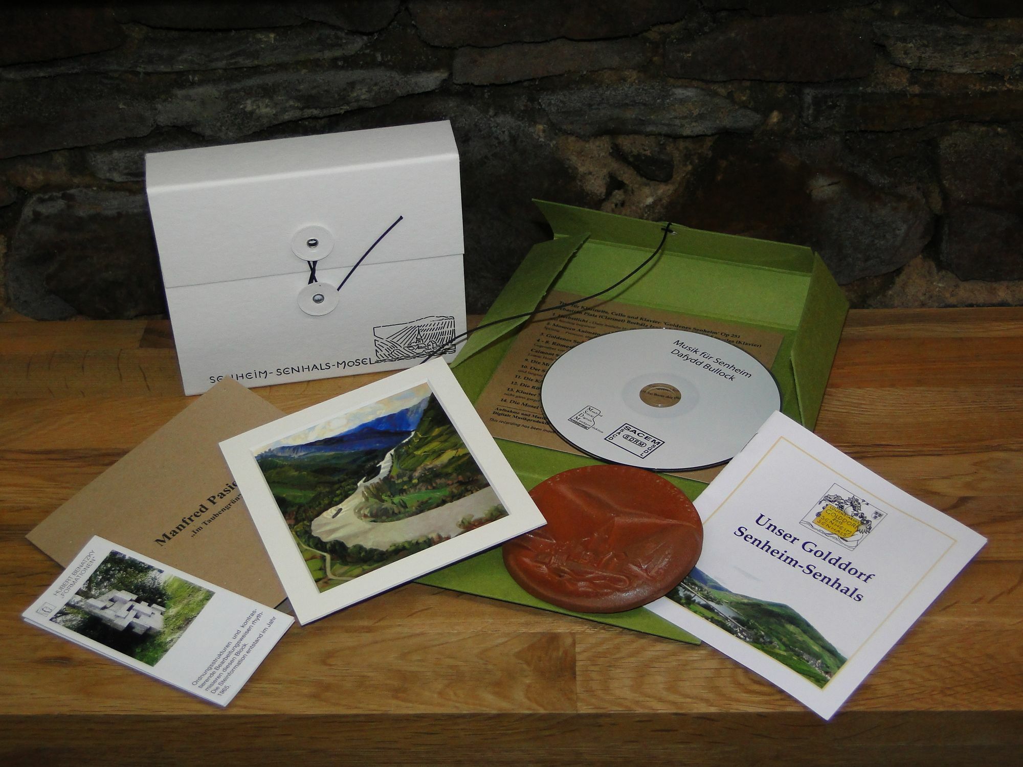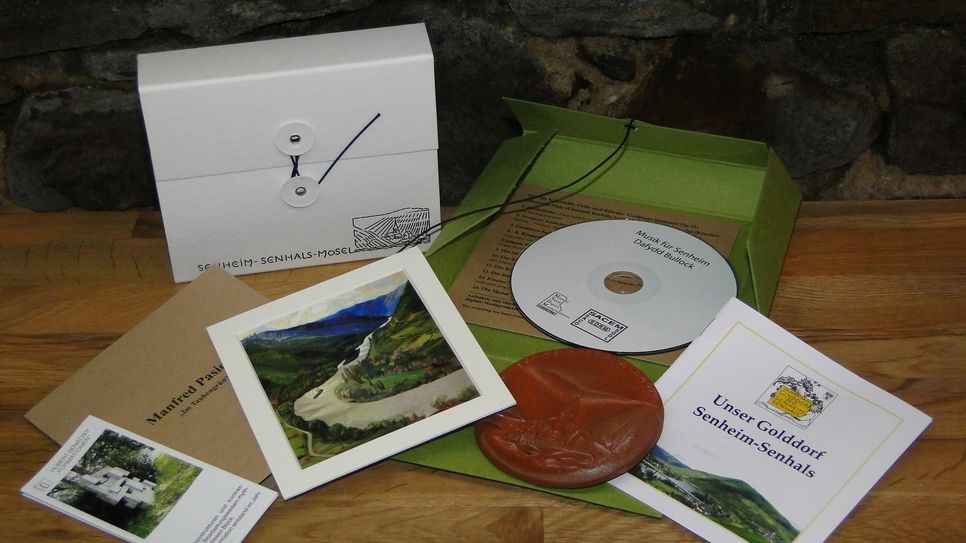 Die Werke der "Kultur-Schachtel": - Christoph Anders: Eine Tonplakette aus Keramik im Durchmesser von rund zehn Zentimetern. Zu sehen ist der Ort Senheim mit der typischen Handschrift von Christoph Anders. Im Holzofenbrand gefertigt, hat jede Plakette ihre eigene Farbgebung. Die Plakette ist einzeln signiert. Die Auflage ist auf 300 Stück limitiert. - Manfred Pasieka: Ein Kunstdruck im Sonderformat des Werkes "Taubengrün". Zu sehen ist auf dem Bild ein Teil des Senheimer Naturschutzgebietes Taubengrün mit Blick auf die Mosel und den Bremmer Calmont - Europas steilster Weinhang. Das Bild ist auf hochwertigem Feinstpapier gedruckt und einzeln signiert. Die Arbeit ist auf 300 Exemplare limitiert. - Dafydd Bullock: Eine CD mit einer eigens für Senheim komponierten und produzierten Sinfonie. Beim Trio für Klarinette, Cello und Klavier: 'Goldenes Senheim' Op 251 sind folgende Musiker dabei: Sebastián Plata (Clarinet) Borbála Janitsek (Cello) Julia Knowles (Klavier). Auf der CD sind 13 weitere Stücke, unter anderem die Calmont Suite, Die Mosel und Der Schiefer zu hören. Eine genaue Beschreibung der Künstler sowie einige Informationen über den Ort sind in einem separaten Booklet zu finden. Als Hinweis zu weiteren Kunstwerken in Senheim und Senhals beschreibt ein Liporello den Skulpturenpark und den Literatenweg. Diese "Kultur-Schachtel" ist bei den Künstlern Christoph Anders und Manfred Pasieka sowie in der Vinothek im Zehnthof und im Weinmuseum zu erwerben. Foto: privat www.senheim.de