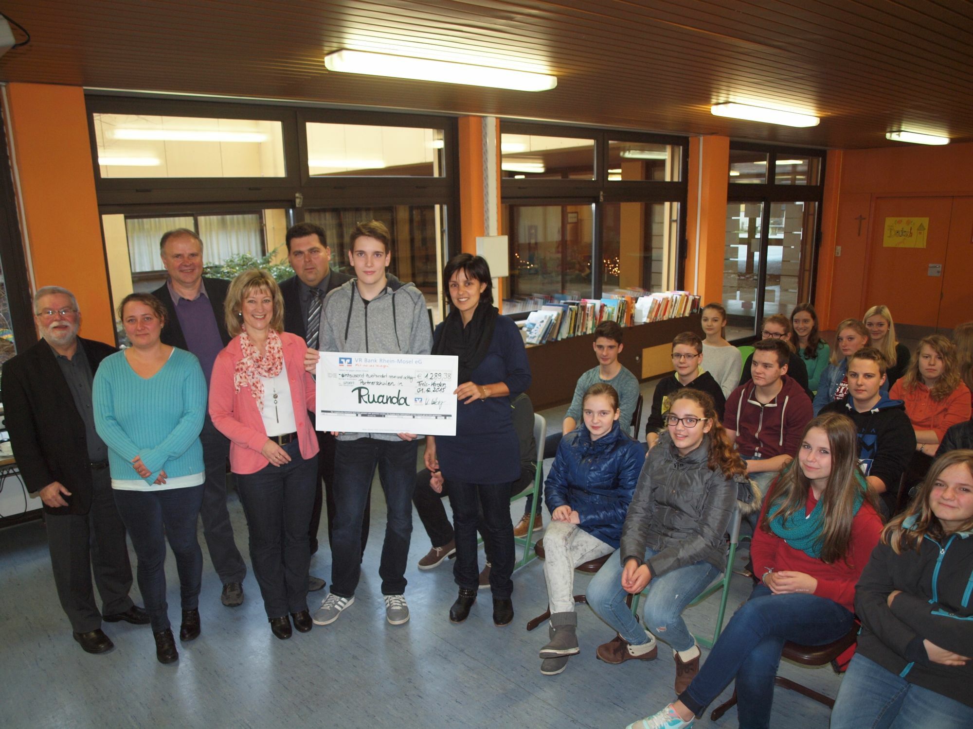 Anke Beilstein konnte einen Besuch an den beiden ruandischen Partnerschulen GS Muko 2 und EP Rusave trotz erheblicher Anreiseschwierigkeiten realisieren, um unter anderem die Briefe der Schülerinnen und Schüler aus Treis-Karden zu überbringen. Am Ende des Besuches überreichten die Schüler der Ruanda- AG einen Spendenscheck in Höhe von 1.289,- Euro. Geld, für das sie und freiwillige Helfer sich sehr eingesetzt haben, unter anderem indem sie zuletzt Bastelarbeiten auf dem Kardener Weihnachtsmarkt verkauft haben. Hier kam die stolze Summe von 153,60 Euro zusammen. "Wir werden sehen, wo unser Geld am sinnvollsten eingesetzt wird und darüber berichten", versprachen die Schülerinnen und Schüler.