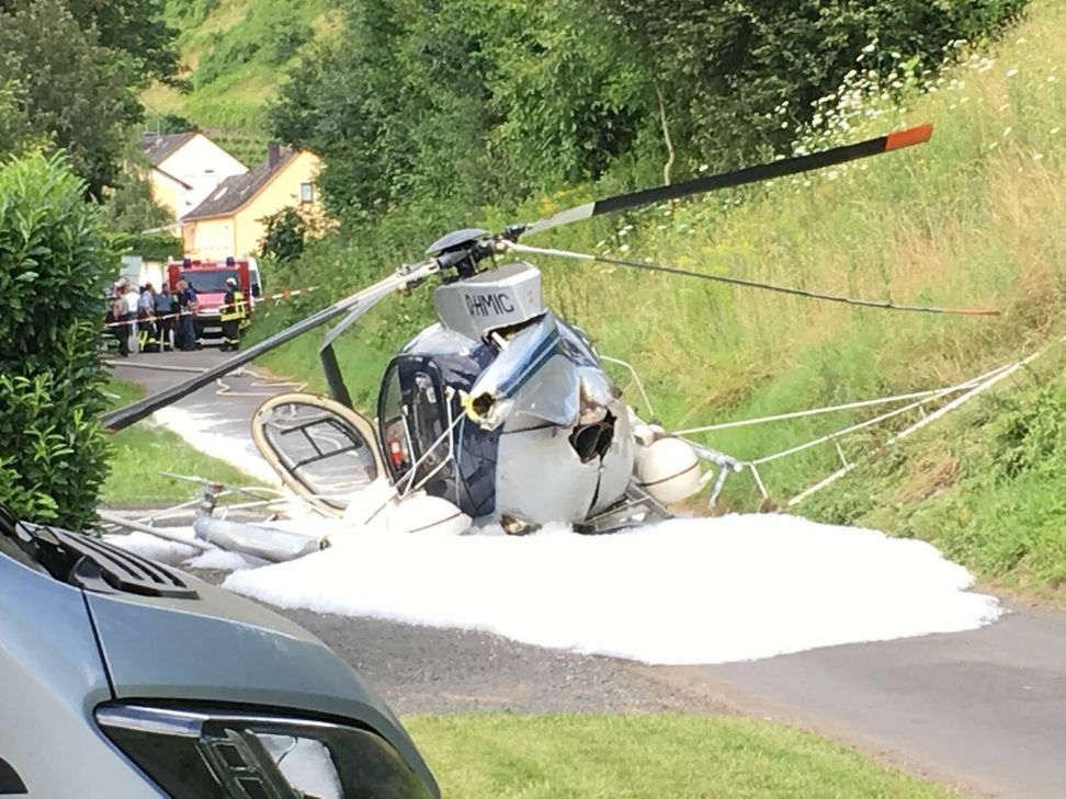 Der Hubschrauber stürzte in einen Weinberg und rutschte anschließend eine Böschung hinunter. Auf einer Nebenstraße eines Wohngebietes blieb der völlig zerstörte Helikopter liegen. Der Pilot, ein 34-jähriger Mann aus Bayern, wurde bei dem Absturz leicht verletzt. Der Hubschrauber wurde durch die Feuerwehr gelöscht. Neben der Polizei und der Feuerwehr waren auch der Rettungsdienst, Notärzte und ein Rettungshubschrauber im Einsatz. Fotos und Video: Zender