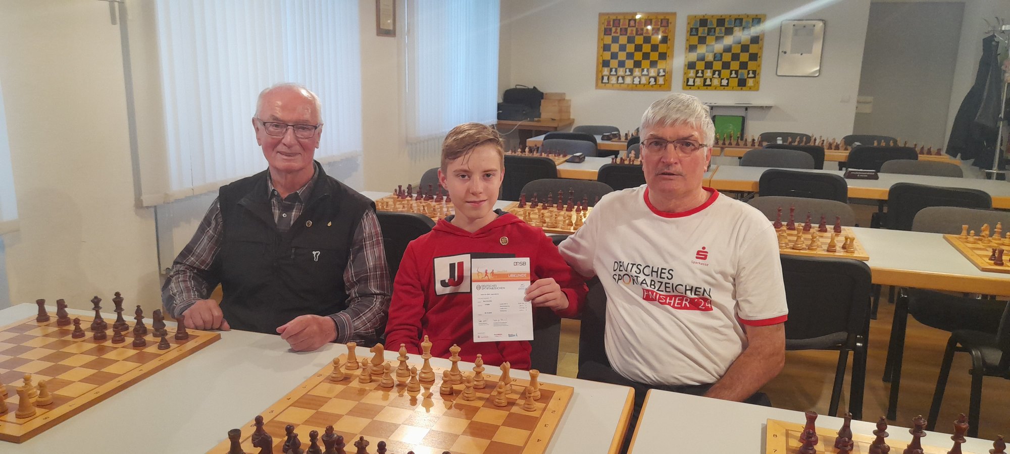 Sportkamerad Gerold Laux hat in diesem Jahr als nun 90-Jährigem zum 42. Male die Leistungen zum Deutschen Sportabzeichen erfolgreich erbracht. Er hat dieses Ereignis genutzt, seine jugendlichen Mitglieder im Schachclub Cochem für das Deutsche Sportabzeichen zu begeistern. Immerhin 7 Schachspieler absolvierten die leichtathletischen Anforderungen. Der Sportabzeichenabnehmer der SpVgg. Cochem, Matthias Klinkner, konnte Ben Schüller in den Räumen des Schachclubs im Kapuzinerkloster gar das Sportabzeichen in Gold überreichen. Das vereinsübergreifende Angebot der SpVgg. Cochem ist sicherlich für andere Vereine oder Gruppierungen nachahmenswert.
