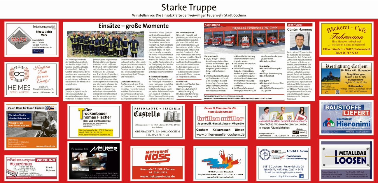 Einsätze - große Momente: Die Freiwillige Feuerwehr der Stadt Cochem setzt sich aus den Löschzügen I und II (Cochem-Stadt), Löschzug IV (Cochem-Sehl), Löschzug V (Cochem-Brauheck) und der Jugendfeuerwehr zusammen. Insgesamt sind 92 Feuerwehrfrauen und -männer im Einsatz, um die Sicherheit der Kreisstadt zu gewährleisten. Jugendfeuerwehr: Engagierte Jugendliche, die Interesse daran haben, auf den aktiven Feuerwehrdienst vorbereitet zu werden, werden jederzeit gerne aufgenommen. Die Jugendlichen der Gruppe (zwischen 10 und 16 Jahren) treffen sich während der Schulzeit jeden Dienstagabend im Gerätehaus der Löschzüge I und II, wo sie die nötigen theoretischen Grundlagenkenntnisse vermittelt bekommen. Aber auch die praktische Ausbildung und interessante Übungen stehen auf dem Programm. Denn trotz allen Ernstes im Feuerwehrdienst stehen gerade in der Jugendfeuerwehr der Spaß und die Motivation an erster Stelle. Neben dem Feuerwehrdienst bietet die Jugendfeuerwehr auch weitere interessante Aspekte, wie beispielsweise die Handhabung der Technik, das Gemeinschaftsempfinden und eine abwechslungsreiche Freizeitgestaltung durch Zeltlager und Wettkämpfe. Letzter großer Einsatz: Am Wochenende vom 9. bis 10. Dezember 2017 wurde die Freiwillige Feuerwehr Cochem zu sieben Einsätzen an nur einem Wochenende gerufen. Im Einsatz befanden sich rund 60 Mitglieder der Freiwilligen Feuerwehr Cochem. Zunächst wurde ein Wohnhausbrand am Valwigerberg gemeldet. Im Anschluss kam es zu Nachlöscharbeiten ebenfalls am Valwigerberg. Auch eine Brandmeldeanlage (BMA) im Kloster Ebernach machte ein Ausrücken notwendig, ebenso wie ein zweiter Wohnhausbrand in Bruttig-Fankel. Darüber hinaus mussten die Einsatzkräfte noch zwei Mal für Nachlöscharbeiten am Valwigerberg aktiv werden. Und zuletzt beschäftigte ein Kellerbrand ebenfalls am Valwigerberg die Feuerwehrmänner. In Erinnerung geblieben: "Die hohe Einsatzbereitschaft der Freiwilligen Feuerwehr Cochem - auch wenn es mal über die eigenen Kräfte geht – ist wirklich großartig und macht aus meiner Sicht unsere Truppe aus", freut sich Wehrführer Günter Hammes über die große Motivation seiner Einsatzkräfte. Der skurrilste Einsatz: Neben aller Dramatik und gleichzeitig auch Schönem, was die Ehrenamtlichen erleben, gibt es von Zeit zu Zeit aber auch skurrile Erlebnisse. "Es kommt immer wieder zu Tier-Rettungen und einmal haben gerettete Schwäne ihre Notdurft während des Transportes im Fahrzeug verrichtet. Skurril ist es aber auch, wenn man nachts an Hotelzimmer klopfen muss und den verschlafenen Gästen sagen muss, dass sie ihr Zimmer verlassen müssen – Bilder, die man nie vergisst", erinnert sich Günter Hammes an einige seiner Einsätze. Nächste Feste: - 16. bis 17. Juni: Waldfest Brauheck (Löschzug V) - 21. bis 22. Juli: Uferfeste Sehl (Löschzug IV) - 15. September: Hoffeste Cochem (Löschzug I und II) Ausstattung: Löschzug I und II: - Ein "TLF 16/24-Tr" - ein Tanklöschfahrzeug mit einem Wasservorrat von mindestens 2.400 Litern an Bord. Die Leistung der Pumpe beträgt 1.600 Liter pro Minute bei 8 bar Ausgangsdruck. - Ein Hilfeleistungslöschfahrzeug 24/16-Schiene (kurz: HLF 24/16-S) mit der Aufgabe der Brandbekämpfung in Tunnelanlagen und die technische Unfallhilfe auf der Schiene. Das Fahrzeug kann jedoch auch wie jedes herkömmliche Löschfahrzeug für den örtlichen Brandschutz eingesetzt werden. - Eine Drehleiter mit Korb - kurz "DLK 18/12" - Ein Tanklöschfahrzeug (TLF 16/24), das eine eingebaute, vom Fahrzeugmotor angetriebene Feuerlöschkreiselpumpe mit einem Nennfördervolumenstrom von 1.600 l/min und einem Löschwassertank von 2.500 Litern besitzt. - Zwei Mannschaftstransportfahrzeuge (MTF und MTF-L), die dem Transport von Personengruppen dienen. - Ein Mehrzweckboot Löschzug IV: - Ein Kleinlöschfahrzeug - kurz "KLF" - Anhänger Wasserversorgung - Ein Rettungsboot Löschzug V: - Ein Mannschaftstransportfahrzeug (MTF) - Ein Staffellöschfahrzeug 10/10 - "StLF" genannt Wehrführer: Bereits seit rund 37 Jahren ist Günter Hammes bei der Freiwilligen Feuerwehr der Stadt Cochem aktiv. "Ich bin schon in jungen Jahren mit der Feuerwehr in Berührung gekommen, da mein Vater dort aktiv war und so bin ich 1981 ebenfalls Mitglied geworden. Später war es dann die Lust zu helfen, der Umgang mit Technik und die Gewissheit, etwas Gutes für die Allgemeinheit zu tun, was meine Verbindung gestärkt hat. Und irgendwann stellt sich dieses 'Helfer-Syndrom' ein", erklärt Hammes selbst. Heute ist der 54-Jährige Wehrführer der Freiwilligen Feuerwehr Stadt Cochem und seit 2000 auch Kreisjugendfeuerwehrwart des Landkreises Cochem-Zell. Homepage: www.feuerwehr-cochem.de Facebook: www.facebook.com/FeuerwehrJugendfeuerwehrStadtCochem Foto: Feuerwehr Cochem