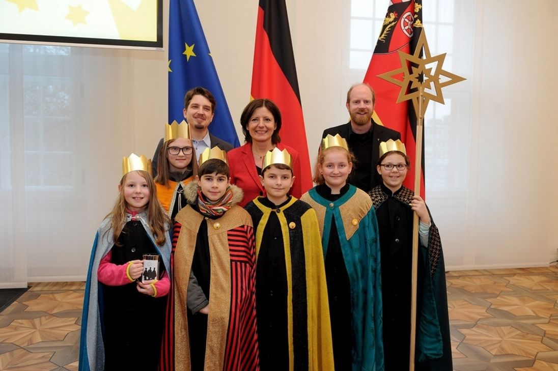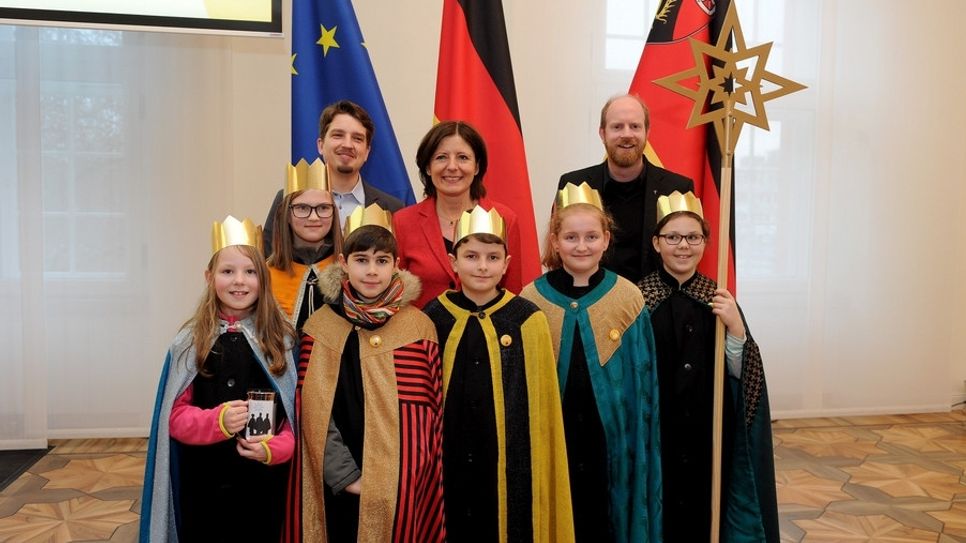 "So etwas erlebt man ja nicht alle Tage", sagt die 14-jährige Laura aus der Pfarreiengemeinschaft Blankenrath. Die Sternsinger aus dem Bistum Trier brachten gemeinsam mit Sternsingern aus den Bistümern Speyer, Limburg und Mainz den Segensspruch "Christus mansionem benedicat - Christus segne dieses Haus" an Bürotüren in der Staatskanzlei an und sangen Lieder. "Ich bin ziemlich aufgeregt, weil ich auch einen Text vortrage", sagt der neunjährige Ernst aus Blankenrath. "Es ist eine schöne Tradition", so Ministerpräsidentin Malu Dreyer. Es sei inspirierend zu sehen, "wie sich auch die Kleinsten in unserer Gesellschaft für andere einsetzen." Die diesjährige Sternsingeraktion trägt das Motto: "Segen bringen, Segen sein. Gemeinsam für Gottes Schöpfung - in Kenia und weltweit". Im Mittelpunkt stehen der Klimawandel und seine Folgen für Kinder und Jugendliche in Afrika. Foto: privat