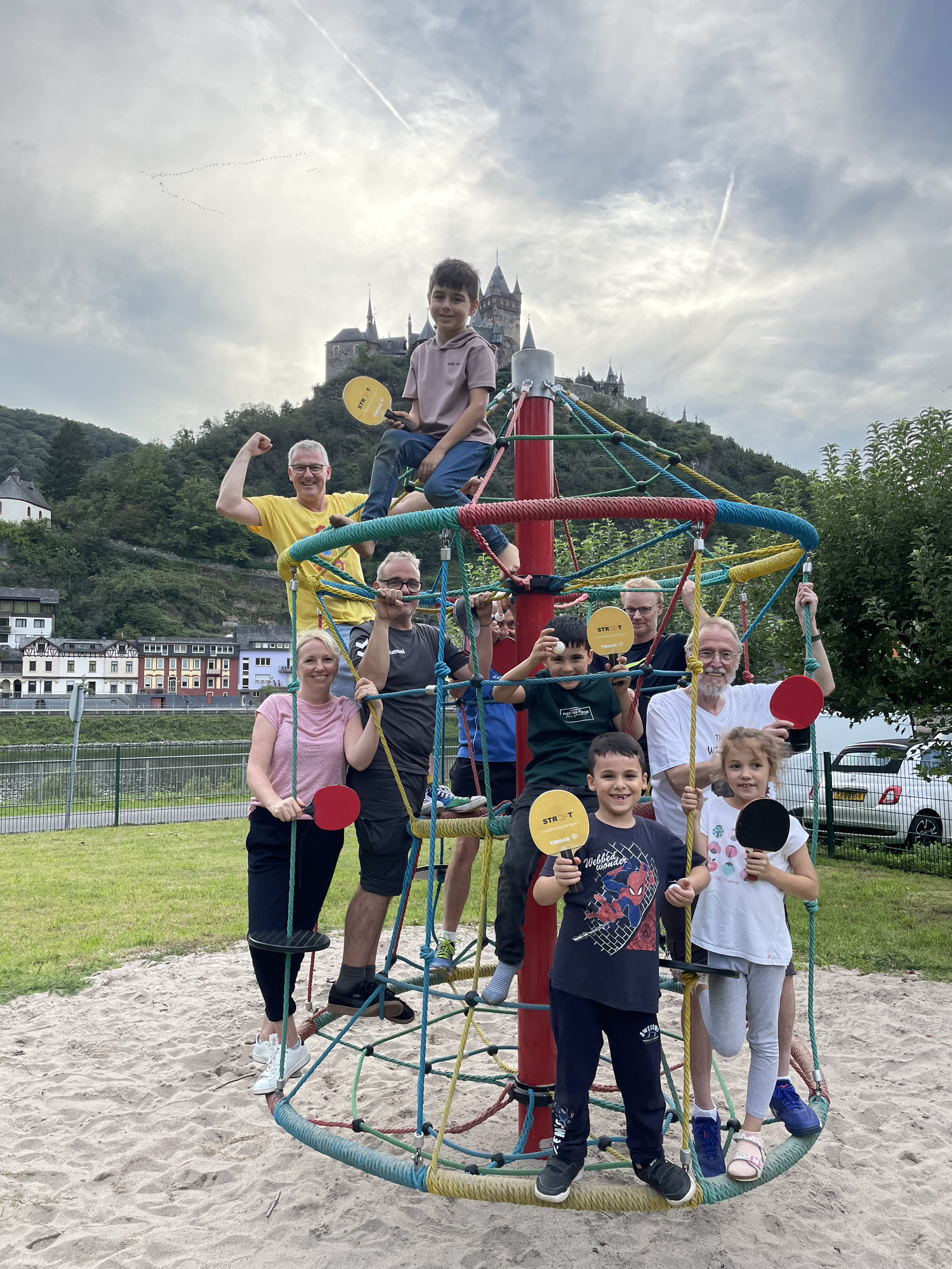 Gestern hat das letzte Grand Slam der Outdoor-Tischtennis Turnierserie der StraßenTischTennis Cochem (STTC) Gruppe stattgefunden. Der Austragungsort war diesmal der wunderschön gelegene Spielplatz am Kaas in Cond mit Blick auf die Reichsburg Cochem. Der kleine Spielplatz grenzt direkt an einem Boolplatz und den Bewegungssteinen XL Aktivtreff in der Uferstraße Ende Cond / Richtung Valwig. Die frei zugängliche Tischtennisplatte auf dem Spielplatz wurde von zwei Tischtennisplatten vom TV Cochem ergänzt. Gespielt wurde ein 2-er Mannschafts-Turnier. Die Clubatmosphäre mit Musik, die mitgebrachten Campingstühle und der dazugehörige Wind trugen zu einer besonderen Atmosphäre unter freiem Himmel bei. Am Start waren 3 Mannschaften mit Spielern aus Ernst, Cochem und Koblenz. Die Tischtennis-Szene kennt sich untereinander, aber auch viele Zuschauer, Straßen-Spieler, Anfänger und Kinder waren willkommen und griffen ins Spielgeschehen ein. Frei nach dem Motto „geeignet für Jung und Alt, Tischtennis halt“. Die Sieger des Abends hießen Bernd Schuler, TV Cochem / SV Eintracht Mendig und Thomas Monreal, TuS Fortuna Kottenheim. Beim StraßenTischtennis geht es um Wettkampf aber auch um das entspannte Zusammensein und darum, eine gute Zeit zu haben. Und wenn dann noch einer der letzten Conder Winzer zu seinem selbst gemachten Wein einlädt und auch zum Schläger greift, ist eine Steigerung kaum noch möglich. „Das war wohl ein sehr schöner Spätsommertag, und wir hatten einen tollen Abschluss unserer Outdoor-Turnierserie und möchten uns bei allen SpielerInnen Bedanken die bei den vier Grand Slams mitgespielt haben. Mal schauen, was uns nächstes Jahr noch so einfällt.“, freute sich das Team vom STTC. „Wir möchten uns auch ganz herzlich für die Unterstützung in Cond bei den Cunner Tischtennisfreuden Jutta Michels, Karosseriebau Michels, Klaus Möllmann und Paul Lenz bedanken.“
