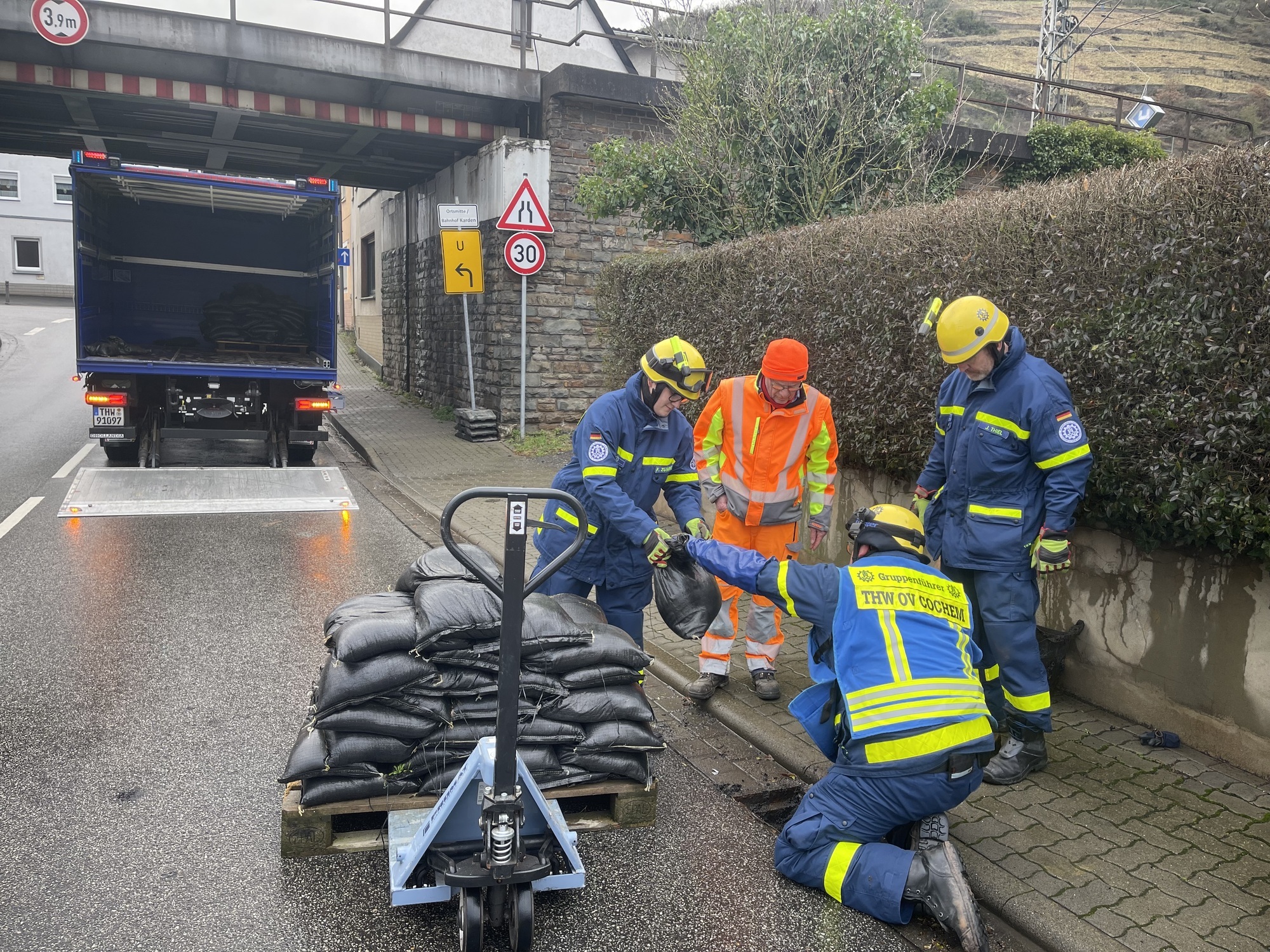 Treis-Karden. Im Treis-Kardener Ortsteil Karden ist zur Zeit das THW im Einsatz. Mit Sandsäcken soll eine Durchfahrt vor Hochwasser gesichert werden. So soll der Ort von der Bundesstraße erreichbar bleiben, da eine zweite Einfahrt nach Karden derzeit wegen Bauarbeiten gesperrt ist.