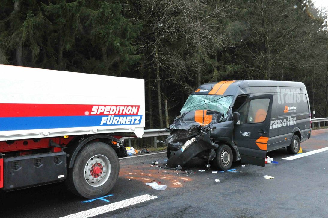 Der Fahrer eines Sprinters fuhr in Höhe des Parkplatzes "Ürsfeld" offenbar mit hoher Geschwindigkeit auf das Heck des Lkw auf. Dabei wurde das Führerhaus des Lieferwagens stark deformiert, der 21-jährige Fahrer eingeklemmt. Der Fahrer des Sprinters verstarb trotz sofort eingeleiteter Hilfsmaßnahmen noch an der Unfallstelle. Die Autobahn musste mehrere Stunden gesperrt werden. Der Sachschaden beläuft sich nach Angaben der Autobahnpolizei Mendig auf rund 40.000 Euro. Die Ermittlungen eines Sachverständigen zur Unfallursache dauern noch an. Foto: Walz