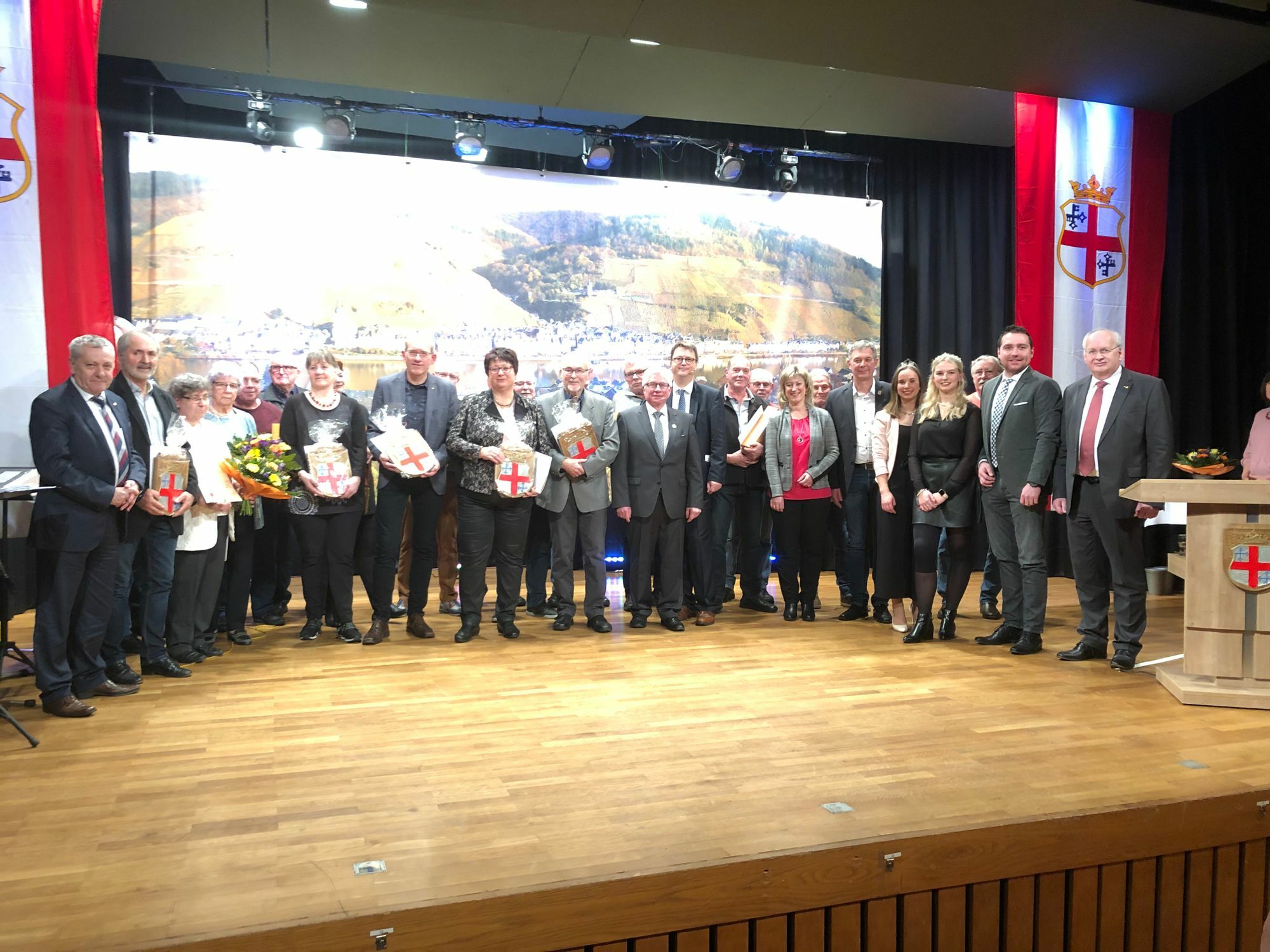 Das vergangene Jahr war, so Hans-Peter Döpgen, in manigfacher Hinsicht ein für die Zukunft entscheidendes. "An erster Stelle möchte ich hier die Suche nach einer Lösung zum Fortbestand der Mittelmosel-Klinik nennen", führte der Stadtbürgermeister eines der dringlichsten Probleme an, das letztlich mit Unterstützung vieler vorerst gelöst werden konnte. Die Ausweisung von Bauland sei eine weitere Zukunftsaufgabe, um den Rückgang der Einwohnerzahlen zu bremsen. Darüber hinaus trat Döpgen nach der Kommunalwahl die Nachfolge von Hans Schwarz als Stadtbürgermeister an. Sieben amtierende und ehemalige Stadtratsmitglieder wurden im Rahmen des Empfangs für 15 Jahre Mitgliedschaft mit dem Wappenschild der Stadt Zell ausgezeichnet: Jutta Koch, Bettina Salzmann, Lothar Bremm, Björn Butzen, Hermann Deisen, Armin Haas und Heinz-Willi Nickels. Danke gesagt wurde auch der Gruppe "Wir für Zell", rüstigen Rentnern, die seit zwei Jahren in und um die Stadt anpacken, wo es notwendig ist. Gretel Dobrick, die sich im Besuchsdienst der evangelischen Kirchengemeinde engagiert, und Margarete Klein, die insgesamt 45 Jahre beim Malteser Hilfsdienst und beim DRK aktiv ist, wurden im Rahmen der Veranstaltung ebenfalls für ihren bürgerschaftlichen Einsatz geehrt. Foto: Christa Herges www.zell-mosel.com