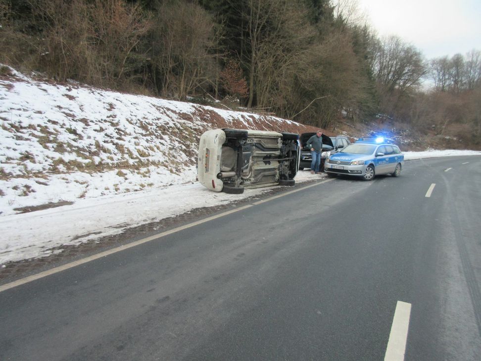 In einem Kurvenbereich war der Frau - nach eigenen Angaben - auf ihrer Fahrbahnseite ein Lastwagen entgegengekommen, weshalb sie, um einen Frontalzusammenstoß zu vermeiden, nach rechts auswich und sich in der angrenzenden Böschung überschlug. Das Fahrzeug blieb schließlich am Fahrbahnrand auf der Seite liegen. Von dem Lkw ist zurzeit nichts weiter bekannt. Der Fahrer fuhr weiter, ohne anzuhalten. Die Autofahrerin wurde vom DRK erstversorgt. Hinweise auf den unfallverursachenden Lkw an die Polizeiinspektion in Zell unter 0 65 42 / 9 86 70. Foto: Polizei