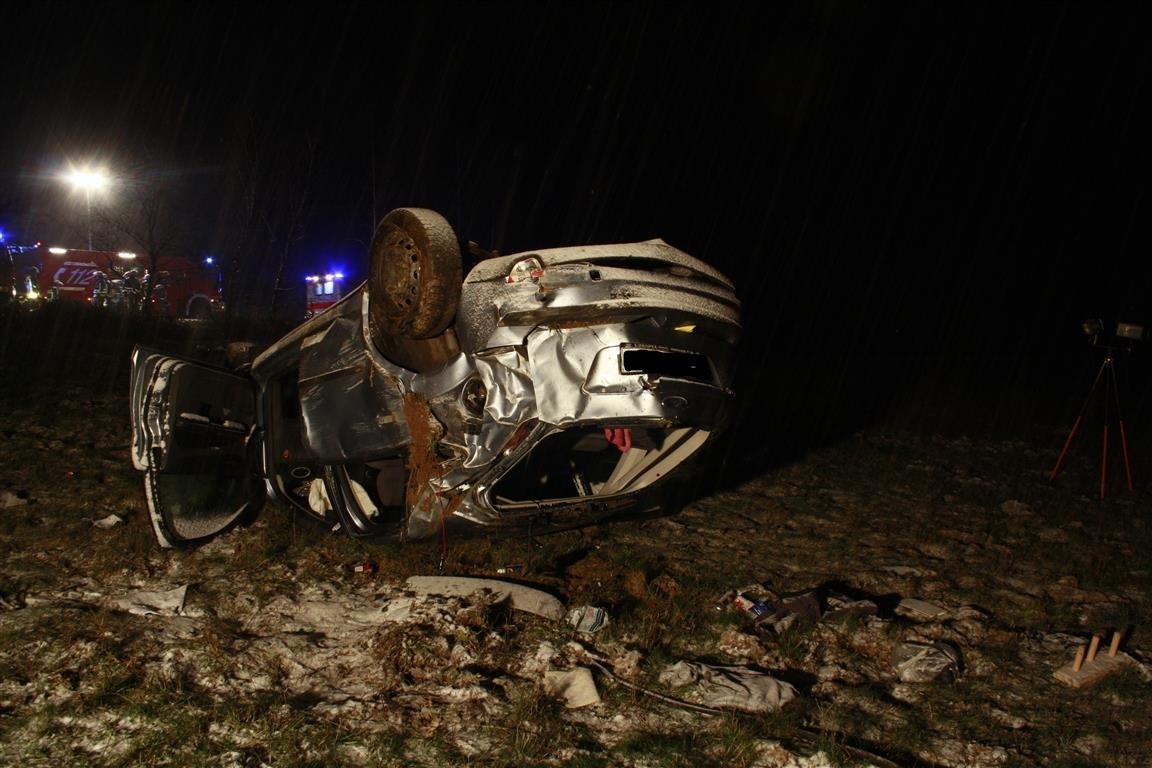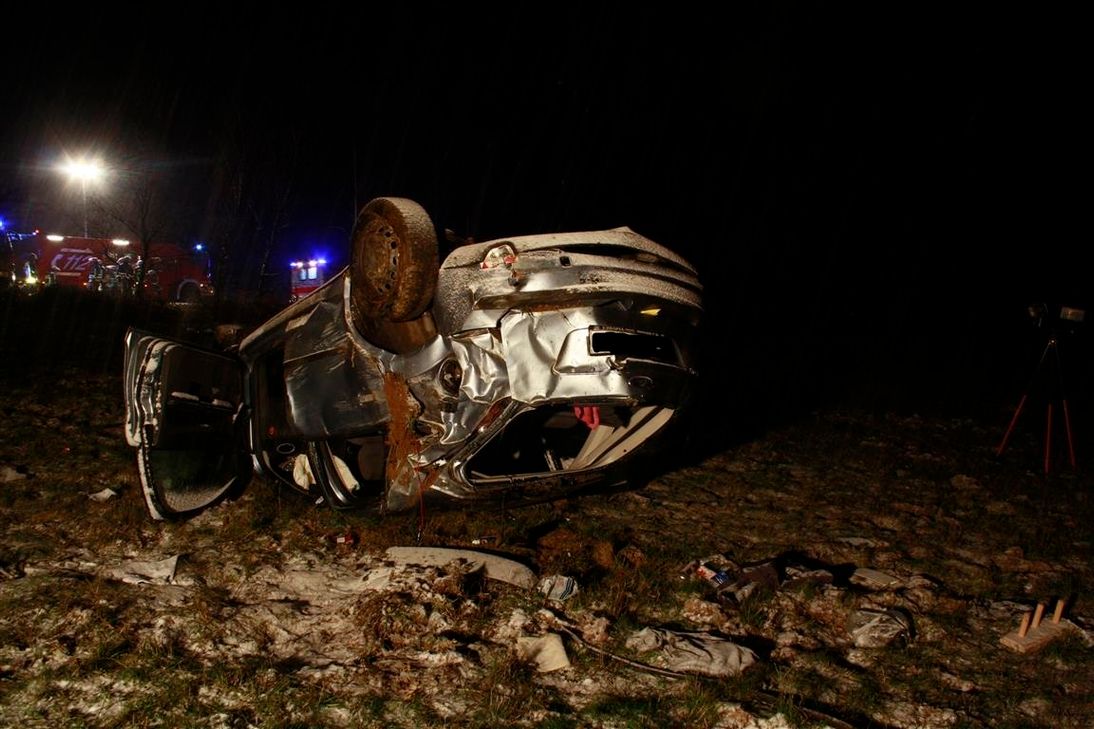 Auf winterglatter Fahrbahn war der Mann, so die Polizei, vermutlich mit deutlich überhöhter Geschwindigkeit unterwegs. Im Kurvenbereich kam das Auto von der Fahrbahn ab und überschlug sich mehrfach. Der Fahrer wurde von der Freiwilligen Feuerwehr aus dem Fahrzeug befreit und nach notärztlicher Versorgung in eine Klinik gebracht. Foto: Polizei