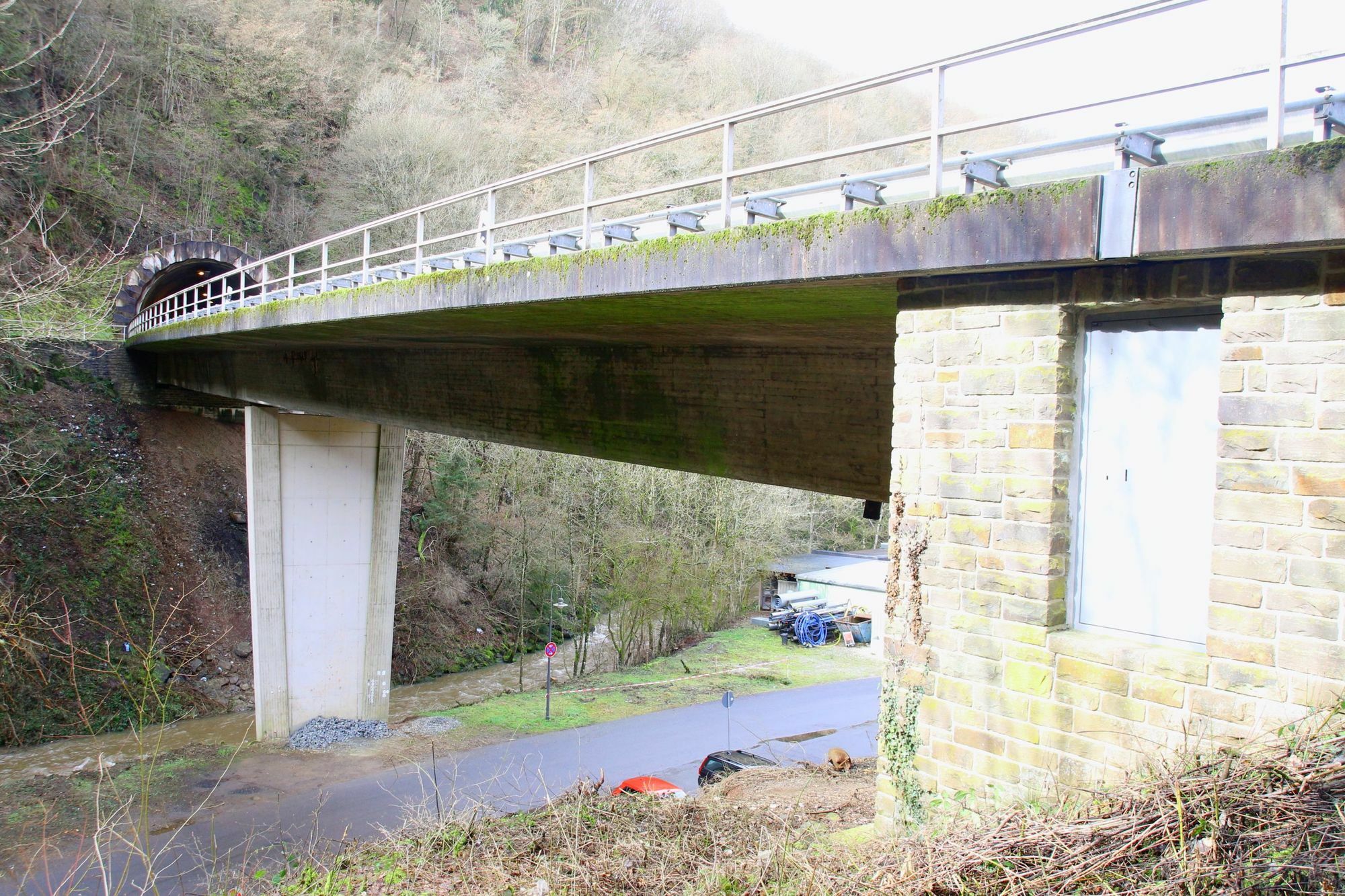 Die 1976 erbaute Brücke weist eine Reihe von Schäden auf, die, so der Landesbetrieb Mobilität (LBM) Cochem-Koblenz, eine umfangreiche Instandsetzung erforderlich machen, um die Bausubstanz dauerhaft und in gutem Zustand zu erhalten. Die Arbeiten zum jetzigen Zeitpunkt verhinderten eine Zunahme der Schäden und einen daraus später notwendig werdenden Ersatzneubau. Im Rahmen der Maßnahme werden auf der Brücke Geländer, Schutzeinrichtungen und die Brückenkappen aus Stahlbeton abgerissen sowie der Fahrbahnbelag und die Abdichtung entfernt. Es erfolgt eine Instandsetzung der Fahrbahntafel. Auch die Fahrbahnübergänge am Anfang und Ende der Brücke werden ausgebaut und durch neue, moderne Übergänge ersetzt. Darüber hinaus werden die Schutzeinrichtungen auf dem Bauwerk und an den anschließenden Straßenbereichen sowie am Übergang zum Tunnelportal erneuert. An der Brückenunterseite würden insbesondere die durch herabtropfendes Wasser geschädigten Stellen repariert. Die Brücke erhält abschließend eine schützende Oberflächenbeschichtung. Die Entwässerungseinrichtungen werden erneuert, allerdings werden die Rohre nicht mehr im Inneren des Hohlkastens geführt, sondern von außen sichtbar montiert. Schließlich werden die im Hang auf der Seite Kennfus vorhandenen Köpfe der Erdanker und deren Schutzumrandung instandgesetzt. Die Baukosten in Höhe von circa 1,2 Millionen Euro werden vom Land getragen. Bei entsprechenden Witterungsbedingungen sollen die Bauarbeiten bis Ende des Jahres abschlossen werden. Für die Durchführung der Maßnahme wird eine einstreifige Verkehrsführung mit Ampelregelung eingerichtet. Der Schwerverkehr wird umgeleitet. Foto: LBM Cochem-Koblenz www.lbm.rlp.de