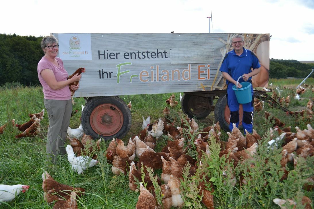Seit Juli verkaufen sie und ihr Mann Gerhard Freilandeier auf dem Nellehof. Lange haben beide, die bereits Schweine züchten, davon geträumt auch Hühner zu haben. Als sie 50 Jahre alt wurden fassten sie den Entschluss, ihren Traum endlich zu verwirklichen. Jetzt sind sie stolze "Eltern" von insgesamt 346 Hühnern und vier Hähnen. Die Eier gibt es nicht nur direkt auf ihrem Hof (Ortsausgang Richtung Hambuch) zu kaufen, sondern auch an einem - extra dafür konzipierten - Automaten (Im Allen 2 in Kaisersesch) selbst zu ziehen. Auch, wenn die Investition für eine Halle und den Automaten nicht günstig war, sind beide froh, diesen Schritt gewagt zu haben. Weitere Informationen gibt es online unter https://www.facebook.com/Das-Freilandei-vom-Nellehof-1703836839911916/ Fotos: Herges