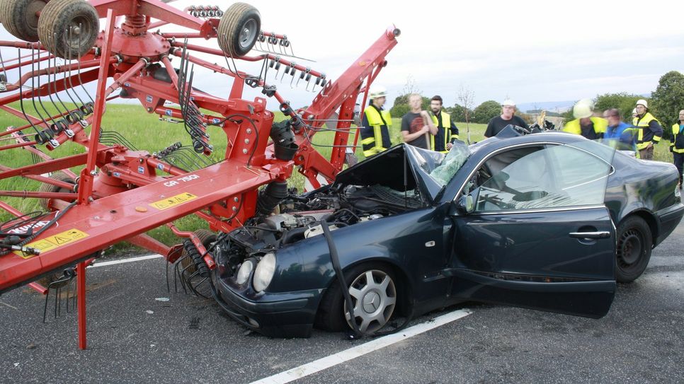 Der 55-Jährige erkannte den vor ihm fahrenden langsamen Traktor offensichtlich nicht und prallte ungebremst auf den angekuppelten Heuschwader. Der Autofahrer wurde in seinem schwer beschädigten Fahrzeug eingeklemmt. Er musste von der Freiwilligen Feuerwehr Kaifenheim aus seinem Fahrzeug befreit und mit schweren Verletzungen in ein Krankenhaus gebracht werden. Der 74-jährige Traktorfahrer erlitt erhebliche Prellungen und einen Schock - er wurde ebenfalls in ein Krankenhaus eingeliefert. Nach ersten Ermittlungen der Polizei kommt Sonnenblendung als Unfallursache in Betracht. Der Sachschaden wird auf rund 20.000 Euro geschätzt. Die L 109 war in diesem Bereich für rund drei Stunden gesperrt. Im Einsatz waren die Freiwilligen Feuerwehren aus Kaifenheim und Roes, Rettungskräfte des DRK, der Notarzt und die Polizei Cochem. Foto: Polizei