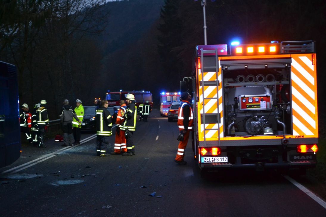 Die junge Frau, die von Briedel in Richtung Zell unterwegs war, kam mit ihrem Auto aus bislang ungeklärter Ursache nach rechts von der Fahrbahn ab. Der Pkw überschlug sich mehrfach, bevor er nach links über die Schutzplanke geschleudert wurde und unterhalb der Fahrbahn liegenblieb. Der Fahrer eines entgegenkommender Linienbusses musste nach rechts ausweichen und touchierte die Schutzplanke. Die Pkw-Fahrerin und ihr 19-jähriger Beifahrer wurden in ein Krankenhaus eingeliefert. Der Busfahrer blieb unverletzt. Die B 53 musste bis 9.55 Uhr Uhr - für die Dauer der Unfallaufnahme - voll gesperrt werden. Im Einsatz waren die Freiwilligen Feuerwehren aus Zell und Briedel, die Straßenmeisterei Alf und das DRK. Sachdienliche Hinweise an die Polizeiinspektion Zell unter 0 65 42 / 9 86 70. Fotos: Christa Herges