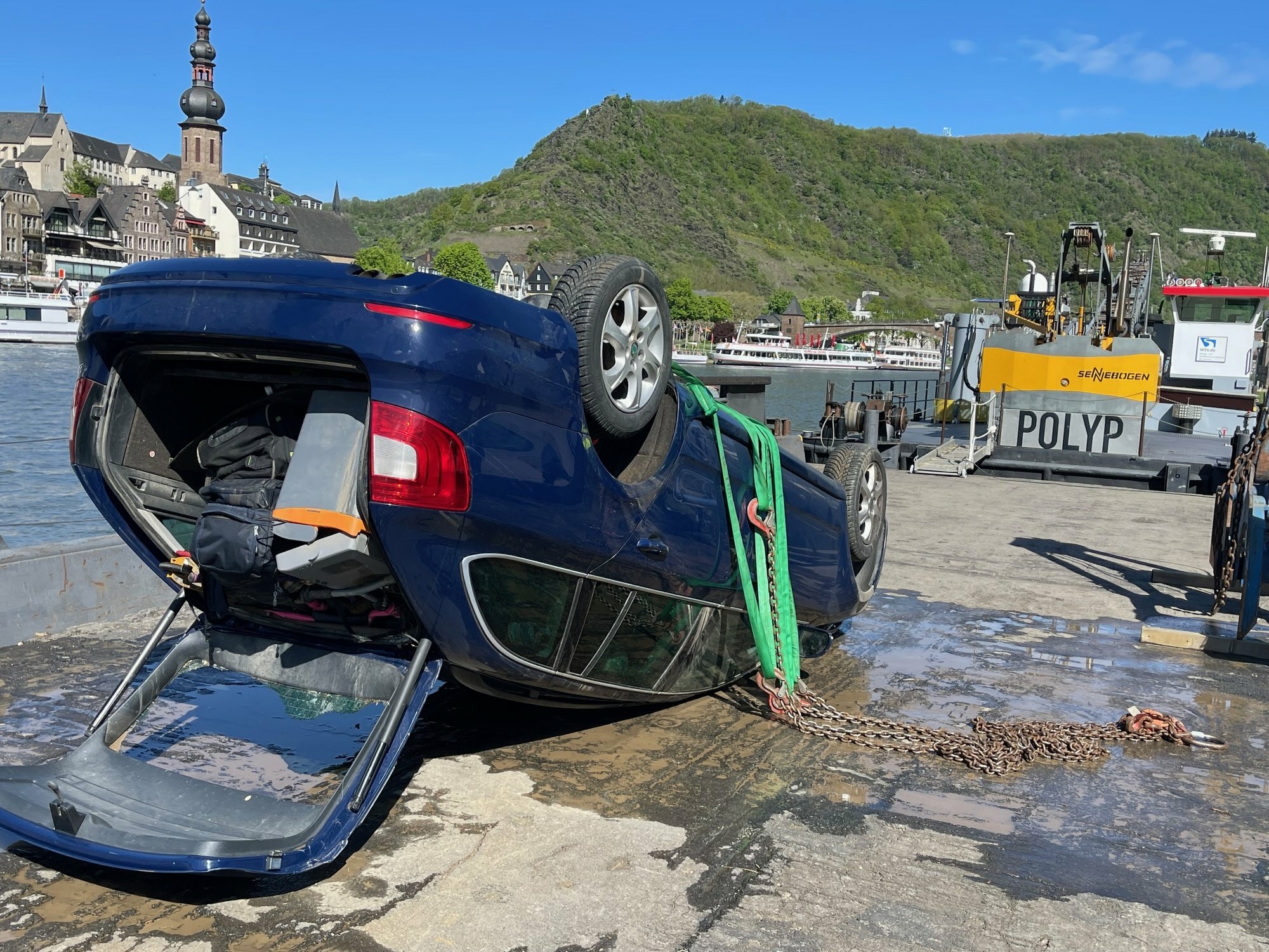 Das Auto, das Anfang April in Cochem in die Mosel gerollt war, wurde am Vormittag geborgen. Zuvor war es mit einem Sonargerät rund 300 Meter unterhalb der Unfallstelle aufgespürt worden. Anschließend hob ein Schwimmkran den blauen Wagen aus dem Wasser. Danach wurde das Auto in den Cochemer Hafen geschleppt und soll von dort aus abtransportiert werden.