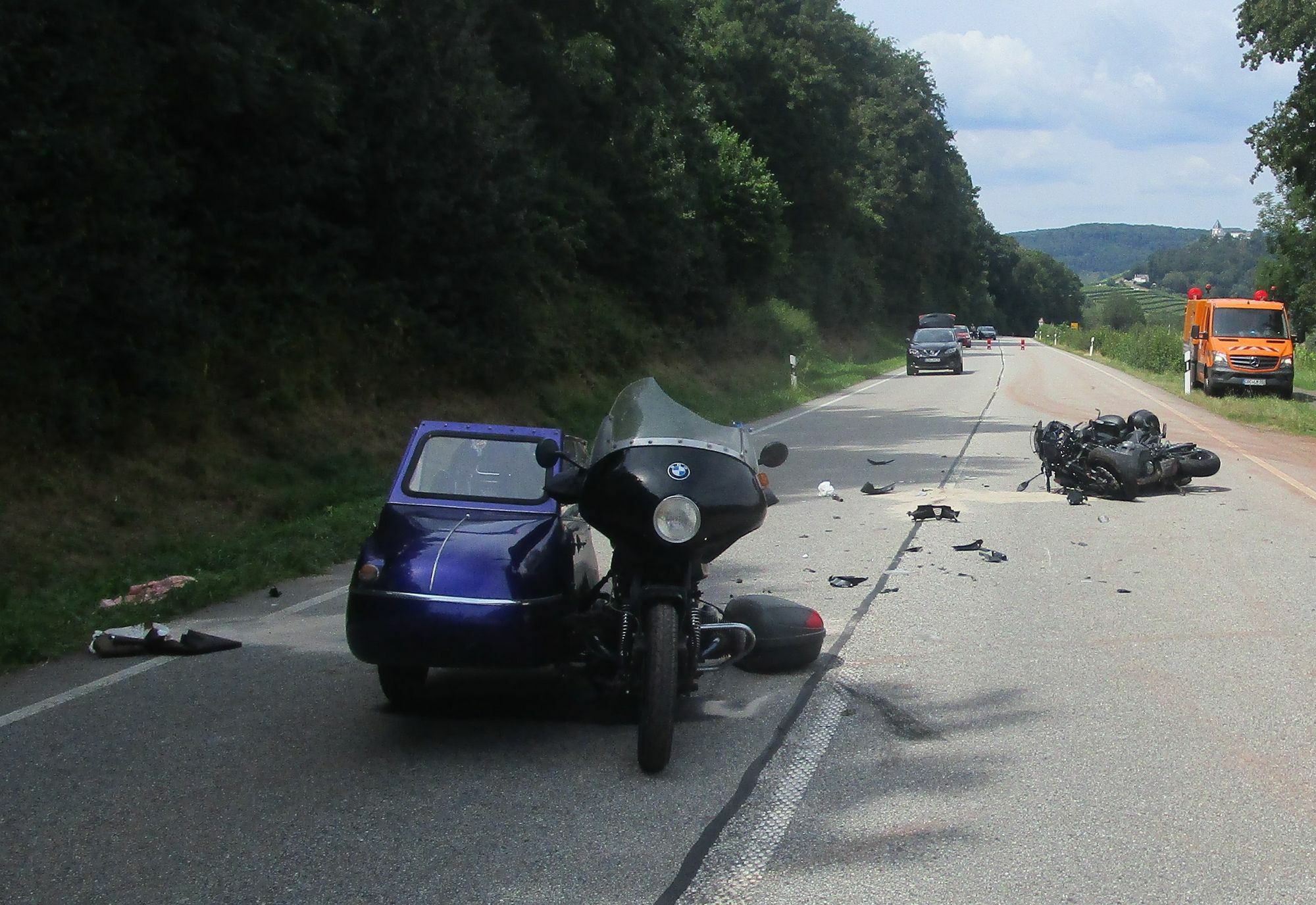 Im Polizeibericht heißt es: Unmittelbar vor der Einmündung zur "Neuen Barlauffahrt" hielt ein 70-Jähriger mit seinem Motorrad mit besetztem Beiwagen zunächst neben der Fahrbahn in Fahrtrichtung Alf an, um zu Wenden. Als sich das Motorrad mit Beiwagen während des Wendevorgangs quer auf dem rechten Fahrstreifen befand, kollidierte ein aus Richtung Zell herannahender 63-Jähriger mit seiner Sozia frontal mit dem quer auf seinem Fahrstreifen befindlichen Motorrad mit Beiwagen. Bei dem Unfall wurden alle vier Beteiligten zum teil schwerstverletzt. Der 63-jährige Fahrer des Motorrads wurde mit dem Rettungshubschrauber in ein Unfallklinikum geflogen. Die drei anderen Verletzten wurden mit Rettungswagen in umliegende Krankenhäuser gebracht. Während der Unfallaufnahme musste die B 53 voll gesperrt werden. Im Einsatz befanden sich die Freiwilligen Feuerwehren aus Briedel und Zell, die Straßenmeisterei Alf, drei Rettungswagen mit Notarzt, ein Rettungshubschrauber und Beamte der Polizei Zell. Foto: Polizei