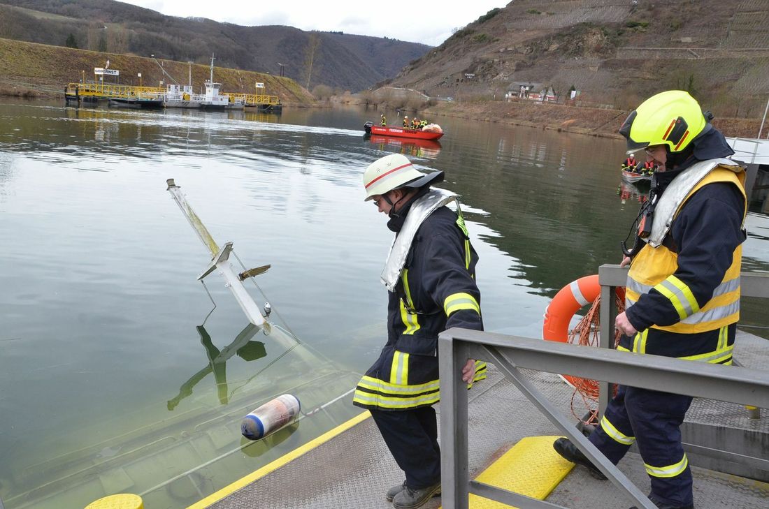 Die Freiwilligen Feuerwehren aus Senheim, Bruttig und Mesenich sowie der Gefahrenzug aus Lutzerath kümmerten sich mit rund 50 Einsatzkräften um auslaufenden Treibstoff, der mit Ölsperren aufgefangen wurde. Kreisfeuerwehrinspekteur Berthold Berenz: "Ich gehe davon aus, dass die Yacht Wasser von außen aufgenommen hat. Dadurch hat das Schiff sehr viel Gewicht bekommen und ist in den Hafen gedrückt worden. Anschließend ist auch der Ponton mit umgekippt." Nach Angaben der Wasserschutzpolizei Koblenz wurde zur Klärung der Unfallursache ein entsprechendes Ermittlungsverfahren eingeleitet. Derzeit verhandelt der Eigentümer des Schiffes, so die Wasserschutzpolizei, wie die Bergung vorgenommen werden kann. "Das ist nicht ganz einfach", wie Feuerwehrchef Berthold Berenz erklärt. "Von den Feuerwehren kann die Yacht nicht gehoben werden, dazu braucht es Luftkissen oder einen Schiffskran." Vermutlich müssen Taucher den Rumpf des Schiffes untersuchen, bevor eine Entscheidung fällt. Die Höhe des Sachschadens kann, so die Wasserschutzpolizei, noch nicht beziffert werden. Foto: Zender