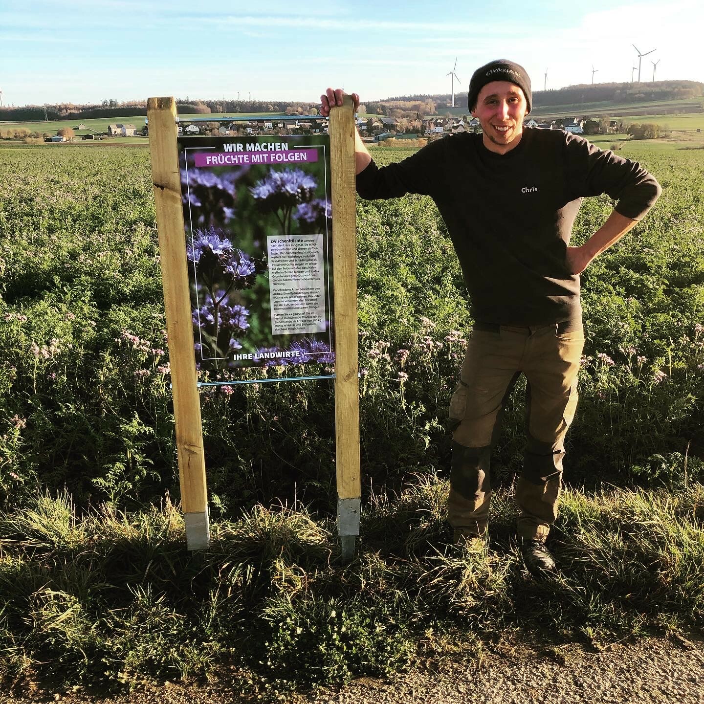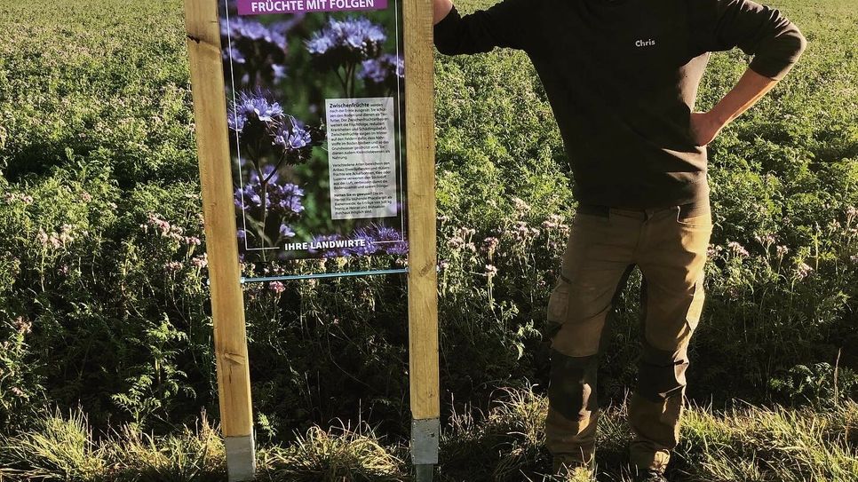 Chris Reisberger, Nachwuchs-Landwirt im Betrieb von Michael Bai, hat die Infotafeln entworfen und aufgestellt. Inspiriert hat ihn ein Besuch der FDP-Bundestagsabgeordneten Carina Konrad aus Bickenbach an der Technikerschule in Bad Kreuznach. "Sie hat uns erklärt, wie wichtig Kommunikation mit dem Verbraucher ist", berichtet der 22-Jährige. Auf den Tafeln finden sich Informationen über den Anbau von Gerste, Raps, Mais und Weizen ebenso wie über den Einsatz von Pflanzenschutzmitteln und Appelle an Wanderer und Spaziergänger: "Helfen Sie uns dabei, den Nährboden für unsere Lebensmittel sauber zu halten, indem Sie Ihren Abfall nicht auf die Äcker werfen und auch den Kot Ihrer Hunde entfernen", heißt es beispielsweise auf einem Schild. "So schafft man Transparenz und Vertrauen", lobt Carina Konrad die Initiative. Foto: Coralie Brandt