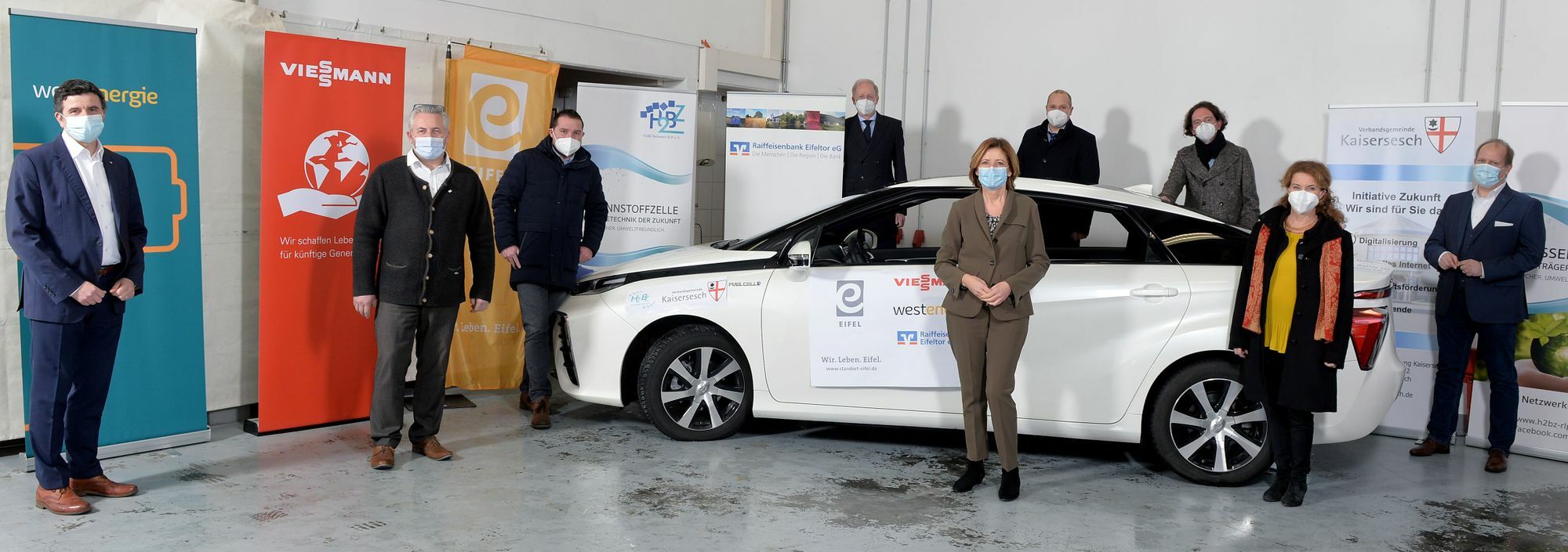 Im Fokus standen das Kooperationsprojekt SmartQuart, das seit 2006 bestehende Wasserstoff-Brennstoffzellen Kooperationsnetzwerk Rheinland-Pfalz (H2BZ Netzwerk RLP e. V.) sowie die Präsentation des Wasserstofffahrzeuges Toyota Mirai. Unter Einsatz von Wasserstofftechnologien werde in Kaisersesch demonstriert, wie erneuerbare Energie für Wärme, Strom und Industrie intelligent mit dem Mobilitätssektor gekoppelt würden. Hierbei werde gewährleistet, dass die Wertschöpfung in der Region bleibt. Ein Modellprojekt, das für alle ländlichen Regionen in ganz Deutschland zukunftsweisend und vor allem auch anwendbar sein werde, so VG-Bürgermeister Albert Jung. "Grüner Wasserstoff, gewonnen aus erneuerbaren Energien, hat das Potenzial, den dringend erforderlichen Weg zu mehr Klimaschutz zu ebnen. Deswegen entwickeln wir auch in Rheinland-Pfalz eine eigene Wasserstoffstrategie und eine Roadmap Wasserstoffwirtschaft. Kaisersesch steht dabei symbolisch für einen Ansatz, den wir in Rheinland-Pfalz verfolgen. Denn bahnbrechende Erkenntnisse entstehen nicht immer nur im urban verdichteten Raum oder in großen Anlagen. Häufig bieten gerade die Abgeschiedenheit und die kurzen Wege die optimale Umgebung für Innovation", sagte Ministerpräsidentin Dreyer. Ziel des Projektes SmartQuart ist es, den Einsatz fossiler Energieträger in den Projektquartieren weitgehend überflüssig zu machen. Es soll zeigen, dass eine klimaneutrale Energieversorgung sowohl technisch als auch wirtschaftlich umsetzbar ist. Malu Dreyer betonte, wie wichtig die richtigen Rahmenbedingungen seien, dies könne man gut an der Energiewende in Rheinland-Pfalz sehen. Vor zehn Jahren habe Rheinland-Pfalz nur 30 Prozent des verbrauchten Stroms im eigenen Land produziert, heute liege das Bundesland bei 70 Prozent. Dabei stamme heute jede zweite Kilowattstunde aus erneuerbaren Energien. Der Anteil erneuerbarer Energien habe sich von 2010 bis heute mehr als verdoppelt. Informationen zum Projekt SmartQuart unter: www.kaisersesch.de/smartquart Foto: Christoph Gerhartz