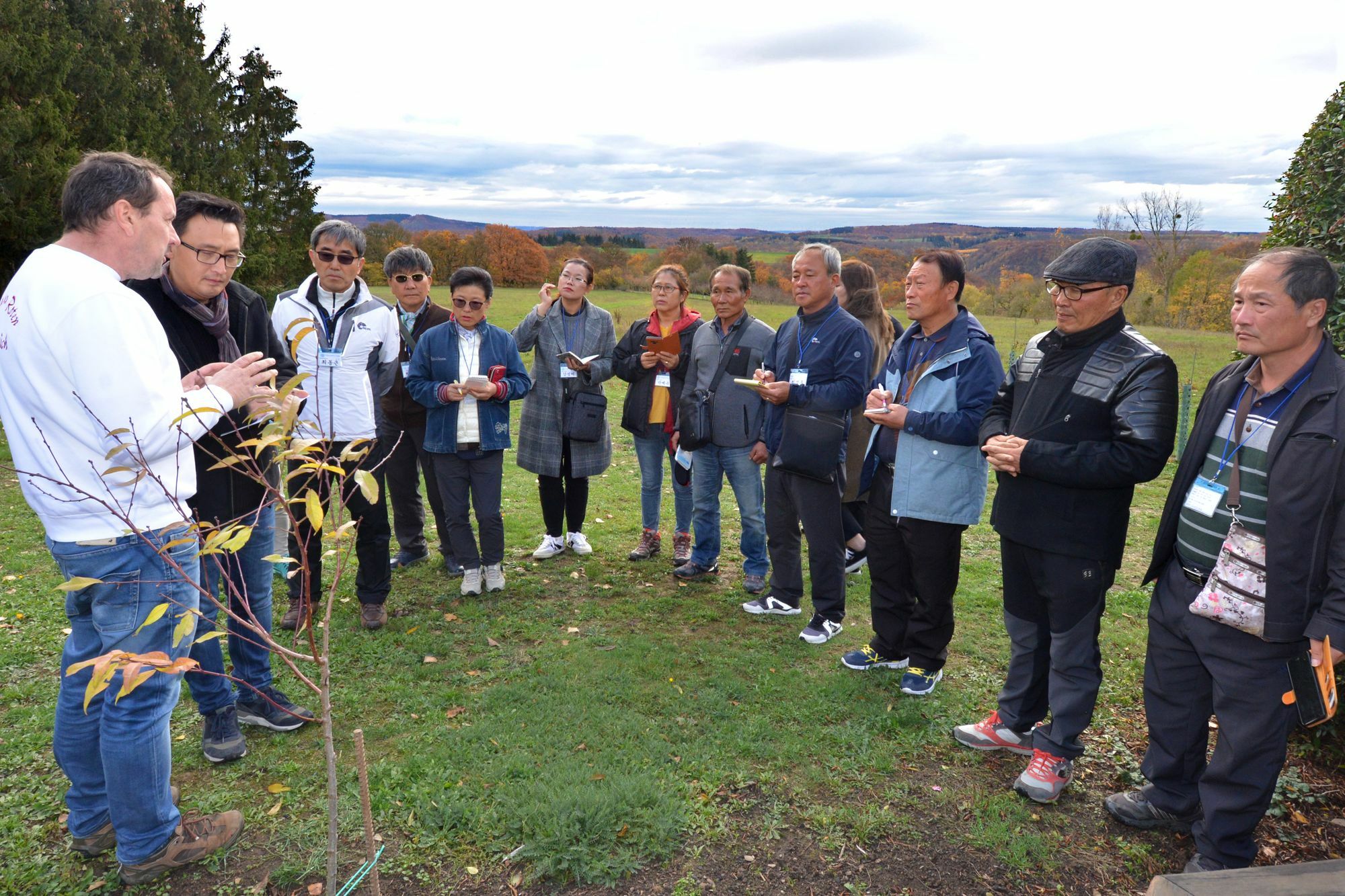 Als Thomas Pitsch vor rund 15 Jahren mit der Zucht von roten Weinbergpfirsichen begann, hätte er es sich - nach eigenen Angaben - nicht träumen lassen, dass sein Fachwissen sogar einmal in Südkorea genutzt wird. Denn eigentlich ist der 51-Jährige kein ausgebildeter Landwirt oder Gärtner, sondern Postzusteller von Beruf. Die Kenntnisse und das, wie es neudeutsch heißt, "Know-how" hat er sich selbst beigebracht und bei Seminaren dazugewonnen. So ist ein reicher Erfahrungsschatz in den vergangenen 15 Jahren entstanden. Und im Laufe der Jahre ist aus einem Hobby ein Nebenerwerbsbetrieb gewachsen, in dem er tatkräftig von seiner Ehefrau Anja (46) unterstützt wird. "Der Rote Weinbergpfirsich ist uns ans Herz gewachsen", beschreibt es Thomas Pitsch. Anders ist es auch nicht zu erklären, dass er gemeinsam mit seiner Frau seine gesamte Freizeit den süßen Früchtchen "opfert". Wie verbunden er mit der Frucht des Weinbergpfirsich ist, zeigt auch sein Geschenkwunsch zum 40. Geburtstag. "Ich habe mir 40 Löcher gewünscht, die mir meine Gratulanten gegraben haben. Dort habe ich dann neue Bäume eingepflanzt. Somit habe ich ein Geschenk, an das ich immer wieder erinnert werde. Etwas Schöneres hätte ich nicht bekommen können." Die Leidenschaft für die Frucht ist Thomas Pitsch anzumerken, wenn er von seinen Erfahrungen berichtet. Das merken auch die 15 Teilnehmer aus Südkorea, die an diesem Montagmorgen seinen Hof besuchen. Bei der Fachgruppe handelt es sich um Stundenten der "Chonbuk National University", eine nationale Forschungsuniversität in Jeonju, Südkorea, mit rund 32.000 Studenten. Nach Angaben von Professor Choi Dong-Geun sei die Delegation fasziniert vom Roten Weinbergpfirsich. "Wir überlegen derzeit, ob wir ihn auch bei uns anbauen können." Thomas Pitsch verdeutlichte den Teilnehmern der Gruppe eindrucksvoll, was beim Schnitt der Bäume zu beachten sei. Und nach der Theorie und der praktischen Anleitung durfte das Verköstigen der Produkte des Roten Weinbergpfirsichs nicht fehlen. Rund 20 verschiedene Produkte stellt Pitsch aus den roten Früchtchen her. So etwa klassisch den Likör oder Brotaufstrich, aber auch ausgefallene Getränke wie Eierlikör mit Roten Weinbergpfirsichen. Für die Gäste aus dem fernen Südkorea wurde schnell deutlich, wie umfangreich die Produkte aus dem kleinen unscheinbaren Pfirsich mit der pelzigen Haut sind. Man sieht aber auch, welche Arbeit dahinter steckt. Denn Pitsch räumt offen ein, dass er aufgrund der Unsicherheit der Erträge aus den Bäumen des Roten Weinbergpfirsichs nicht hauptberuflich leben könne. "Im vergangenen Jahr hatten wir zum Beispiel einen Totalausfall und konnten so gut wie keine Früchte ernten. Das tut dann schon weh." Anders in diesem Jahr, wo das Herz von Andreas Pitsch lachen dürfte: 2,7 Tonnen der reifen Früchte hat er geerntet. "Die frische Verarbeitung in kürzester Zeit war eine Mammutaufgabe." Offenbar hat der engagierte Pfirsich-Landwirt aber auch schon die nächste Generation mit seiner Leidenschaft für den Roten Weinbergpfirsich "infiziert". Denn seine beiden Söhne, 14 und 17 Jahre alt, arbeiten fleißig mit und auf dem Logo des Betriebes steht bereits "Pitsch & Söhne". Und nach dem Besuch der Gäste aus Südkorea dürfte auch dort sicher bei dem einen oder anderen die Leidenschaft für den Roten Weinbergpfirsich von der Mosel entfacht worden sein. Weitere Informationen: www.obstwirtschaft-aus-leidenschaft.de Foto/Video: Zender