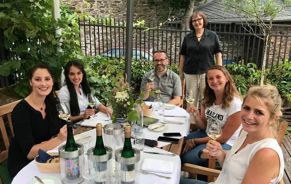 Im steilsten Weinberg Europas wagten die Weinmajestäten den Aufstieg auf dem Klettersteig, um ein hautnahes Gefühl zu bekommen, welche Anstrengungen von Nöten sind, um letztlich den Wein in die Flasche zu bringen. Dabei war die Aussicht ein weiteres einzigartiges Argument für den Besuch der Weinmajestäten. Die Visite an der Mosel war übrigens die erste gemeinsame der Repräsentantinnen des Deutschen Weins nach den Corona-Lockerungen. Eine Einkehr durfte nicht fehlen und die fand bei der Familie Borchert im Springiersbacher Hof in Ediger statt. "Es waren tolle Gäste und es war uns eine Ehre", schwärmte Gabriele Borchert. Dabei hatte es ihr die Deutsche Weinkönigin, Angelina Vogt, besonders angetan. "Sie ist der Hammer und sie hat so viel Temperament. Von ihr werden wir sicher noch viel hören", ist sich die Gastgeberin sicher. Ihre Einschätzung stützt sie auch darauf, dass sie mit ihrem Freund das Nahe-Weingut von dessen Onkel übernehmen will. Wer Nachfolger habe, der dürfe sich richtig freuen, so die Mosel-Winzerin. Im Weingut Springiersbacher Hof gab es neben einem moseltypischen Buffet natürlich auch Weine der Borcherts aus dem Calmont und vom Elzhofberg sowie als Schmankerl noch Whisky aus der eigenen Brennerei. www.weinland-mosel.de