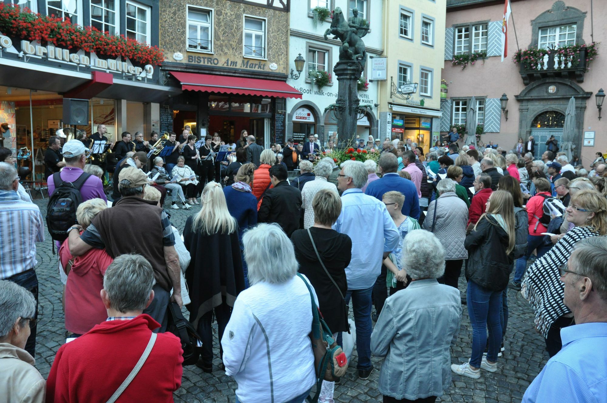 Die "Cochemer Sinfonie" für Glockenspiel und Bläser - geschrieben von der Dekanatskantorin und Organistin von St. Martin, Marion Oswald, - ist gespickt mit Motiven aus Cochemer Liedern "Dä ächte Cochemer Jung", "Cochem Holau" und "Oh Mosella". Zusammen mit einer Bläsergruppe der Winzerkapelle Pommern, des Musikvereins Cochem und der Pfarrei St. Martin unter der Leitung von Manfred Johann setzte Marion Oswald die musikalischen Glockenspiel-Akzente - auch für sie eine Premiere, denn eine Generalprobe gab es nicht. Herausgekommen ist, so Oswald, ein Konzertstück im klassischen Sinne, aber mit modernen Elementen: Das Glockenspiel als Soloinstrument, während die Bläser die Motive aufgreifen, umspielen oder weiterführen. Der ehemalige Stadtbürgermeister Herbert Hilken moderierte das Konzert in seiner ihm eigenen Cochemer Art und animierte auch zum Mitsingen der bekannten Cochemer Lieder. Für den Veranstalter, Manfred Müller, ist in jedem Fall ein "Traum in Erfüllung gegangen". Fotos: Pauly