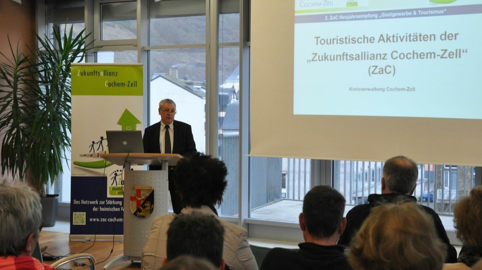 Die Zukunftsallianz Cochem-Zell (ZaC) hat sich - um einer älter werdenden Gesellschaft zu begegnen - deshalb unter anderem das Thema "Fachkräftesicherung" in der Tourismusbranche auf die Fahnen geschrieben. "Ohne die Möglichkeit einzukehren, werden die Touristen wegbleiben", führte Landrat Manfred Schnur im Rahmen des 2. ZaC-Neujahrsempfangs an. Weitere Zukunftsthemen, die allerdings sehr kurzfristig wirken können, sind der Investitionsstau in Hotels und Gaststätten sowie nicht zuletzt die Regelung der Betriebsnachfolge. Bereiche, die bei der ZaC ebenfalls auf der Agenda stehen. Alleine im Bereich der IHK Koblenz stehen in den kommenden zehn Jahren 8.000 Betriebe zur Übergabe an. Ein Umstand, der in einem Vortrag über den Unternehmenswert und mögliche Stellschrauben angerissen wurde. Foto: Pauly www.cochem-zell.de