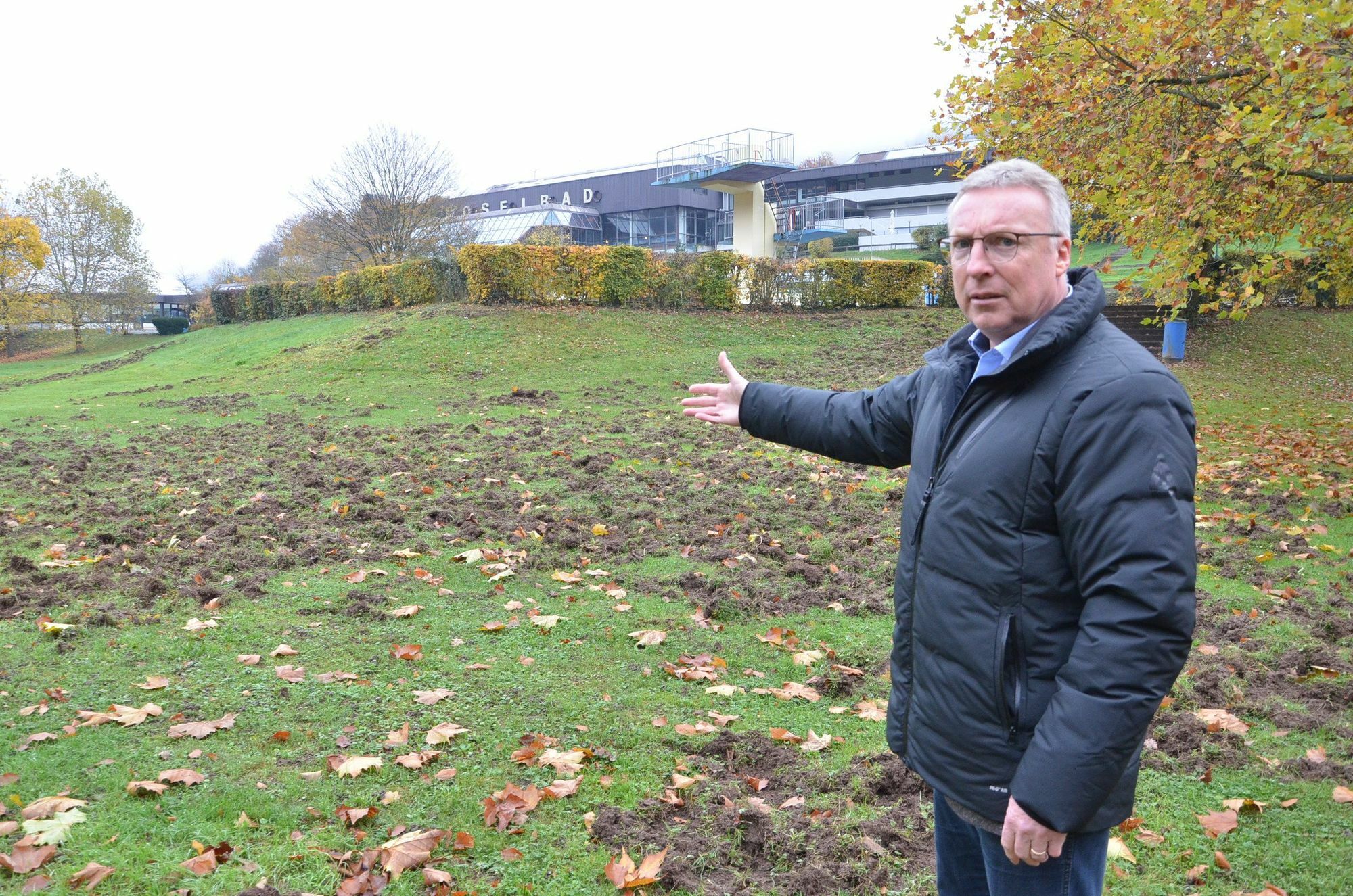 Den Grund für die Erdbewegungen hat Geschäftsführer Schuwerack schnell gefunden: Nachts hatte das Schwimmbad im Cochemer Stadtteil Cond ungebetenen "Besuch" von einer Rotte Wildschweinen. Und die hat bei ihrer Suche nach Futter alles umgegraben. Bernd Schuwerack: "Wir gehen davon aus, dass rund 70 Prozent der Rasenfläche zerstört wurde. Wir versuchen nun einige Bereiche noch zu retten und hoffen, dass dort wieder der Rasen anwächst." Seiner Meinung nach muss die starke Population der Schweine umgehend bekämpft werden. Und Schuwarack ist nicht der einzige der sich aktuell über die Wildschweine ärgert. Zahlreiche Menschen im Cochemer Stadtteil Cond sind sauer auf die Borstentiere, denn sie verwüsten Vorgärten und Rasenflächen. Ab und zu treffen die Schweine auch auf Menschen. So wie es Günter Burg aus Cond erlebt hat. Als er morgens von der Nachtschicht kam, stand plötzlich ein riesiges Wildschwein vor ihm. "Ich hatte Angst, wusste nicht was das Tier macht. Irgendwann ist es dann ins Dickicht verschwunden." Burg traut sich deshalb nachts nur noch mit einem Stock im Gepäck auf die Straße. Stadtbürgermeister Wolfgang Lambertz kennt das Problem und hat bereits reagiert. Er will Jäger, Forstverantwortliche und Ordnungsamt an einen Tisch bringen, um gemeinsam nach Lösungen zu suchen. Weiterhin sollen Flächen im Bereich Cond entbuscht werden, um so Rückzugsflächen für die Wildschweine zu verringern. Foto: Zender
