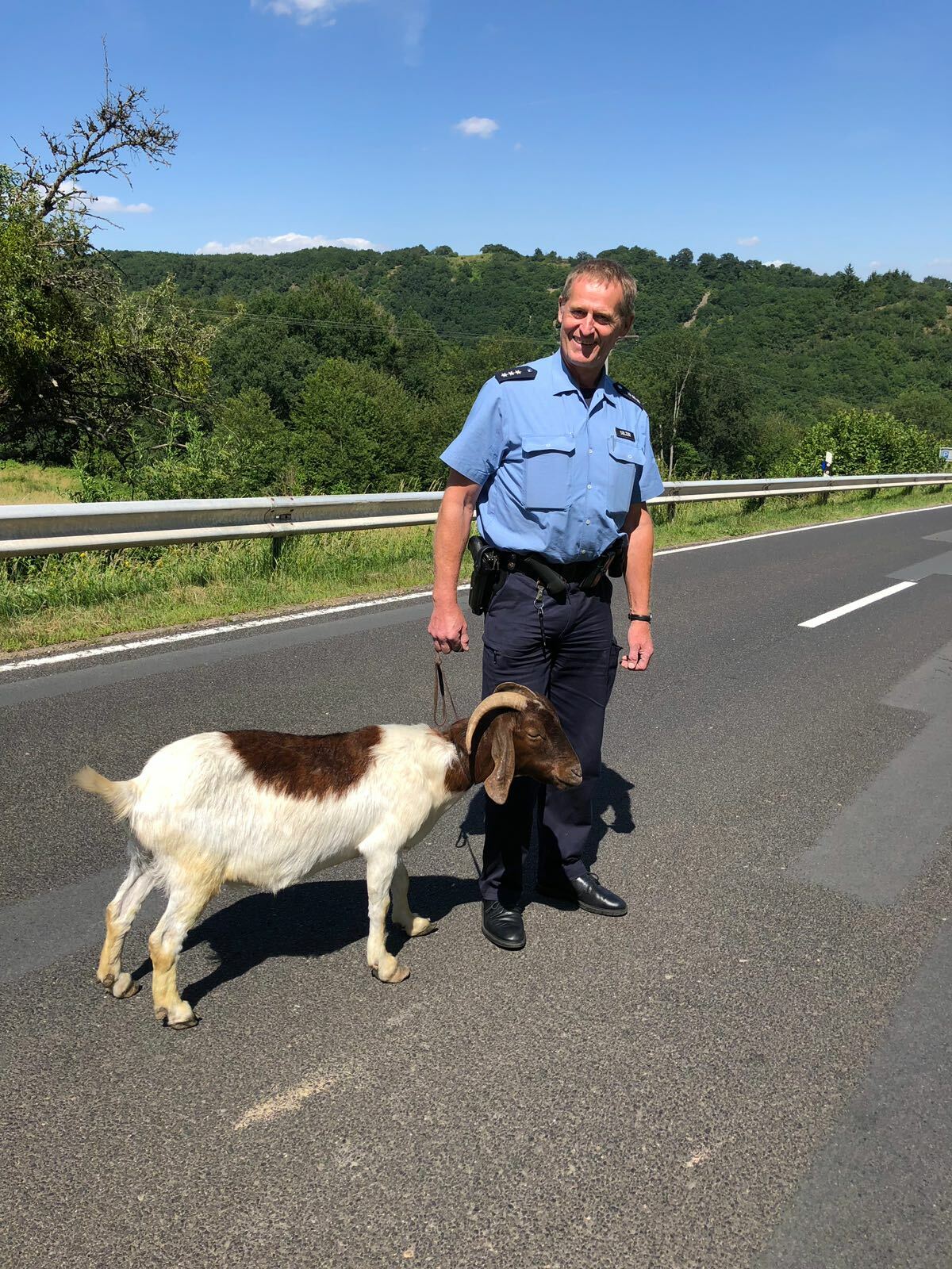 Ein Beamter der Polizeiinspektion Cochem packte das Tier beherzt bei den Hörnern und legte ihm eine Leine um. Vom Besitzer der Ziege fehlt noch jede Spur. Dem Tier blieb die Polizeizelle aber erspart; es fand bei einem Landwirt in der Nähe vorübergehend eine Bleibe. Foto: Polizei