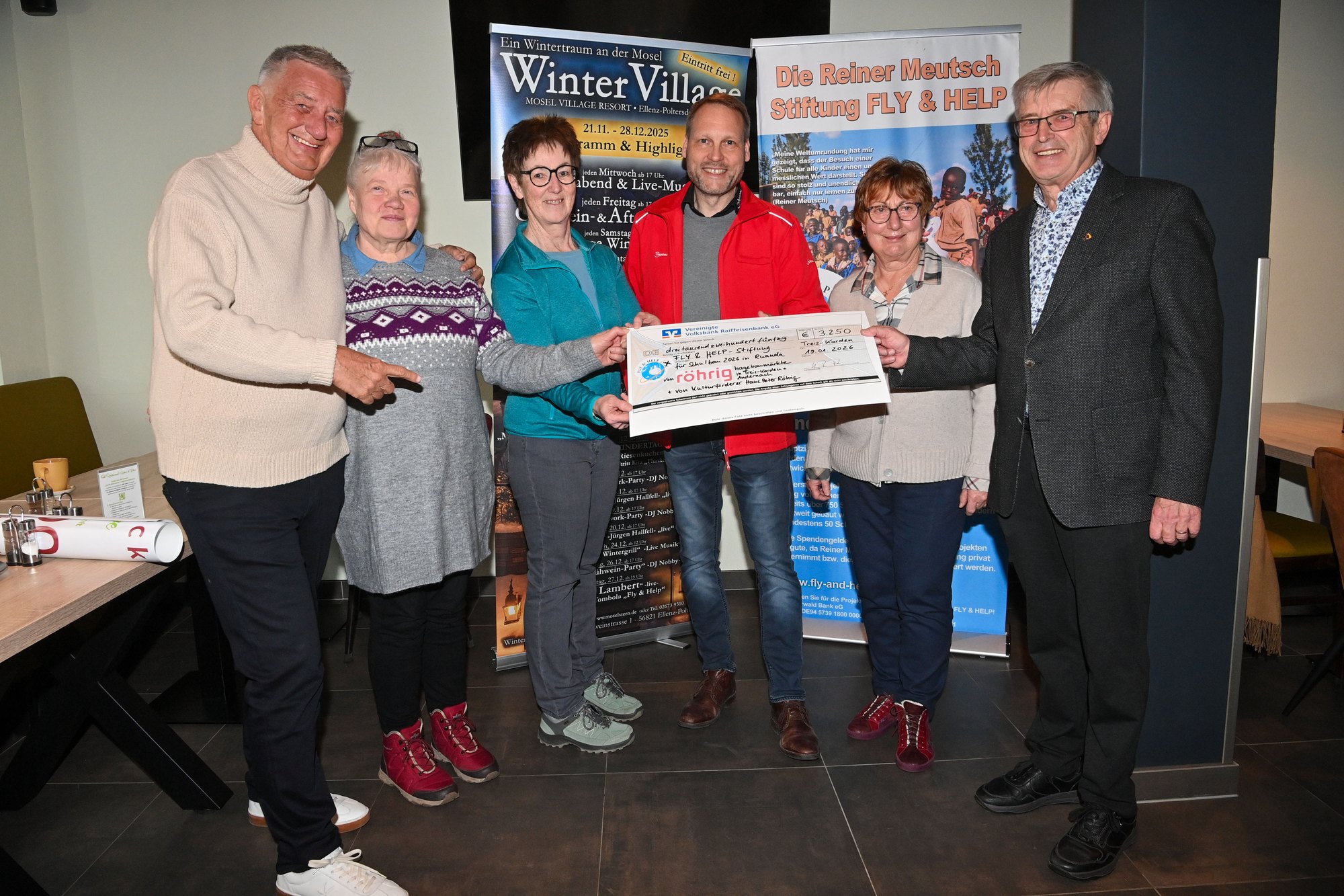 Svetlana und Helmut Dehren überreichten Meutsch einen Scheck in Höhe von 7.500 Euro. Reiner Meutsch bedankte sich herzlich für die Unterstützung der FLY & HELP-Stiftung in der Moselregion. Eindrucksvoll schilderte er die Erfolge der Stiftung, die im vergangenen Jahr mit weltweiter Resonanz die 1.000. FLY-&-HELP-Schule eröffnen konnte.