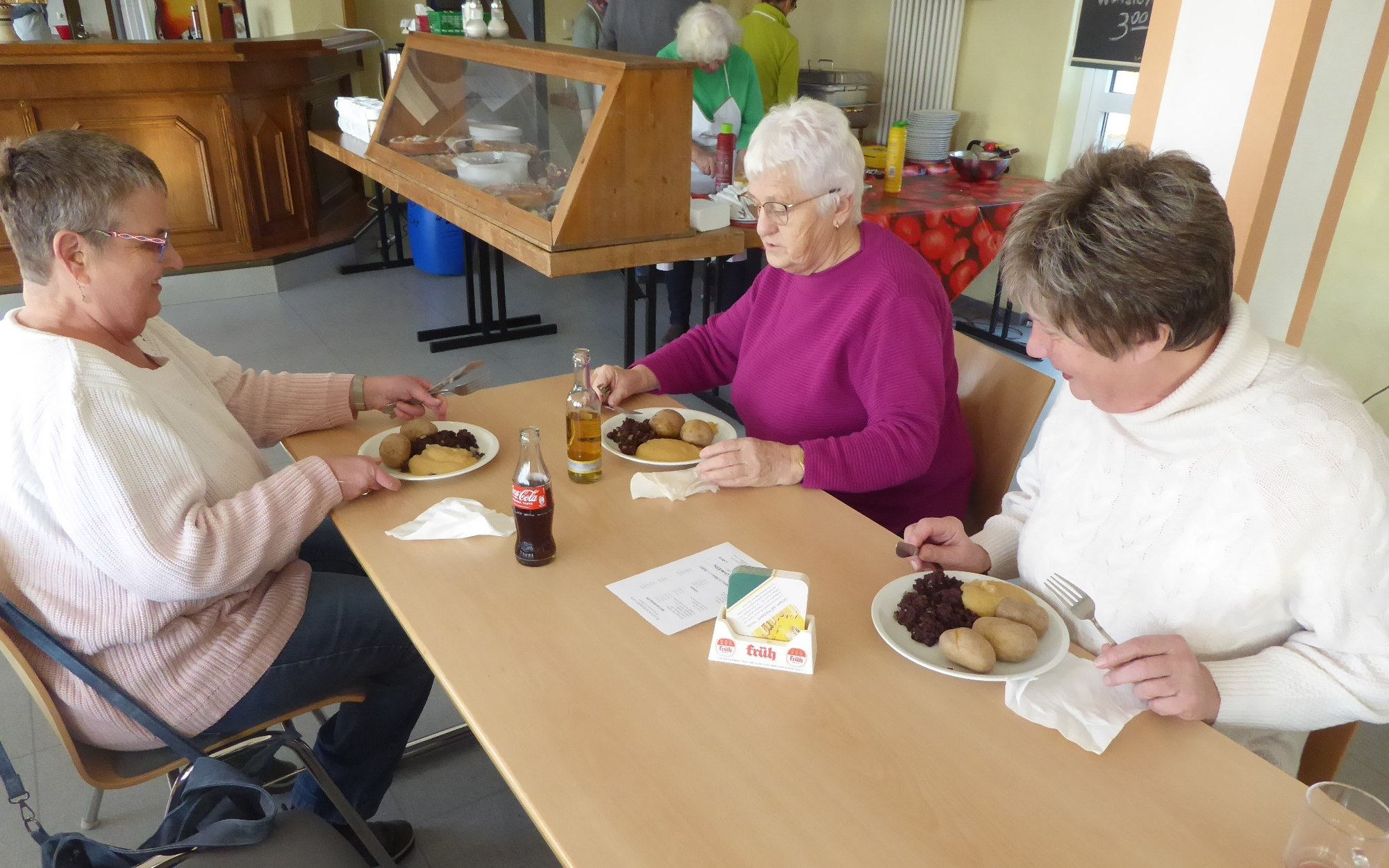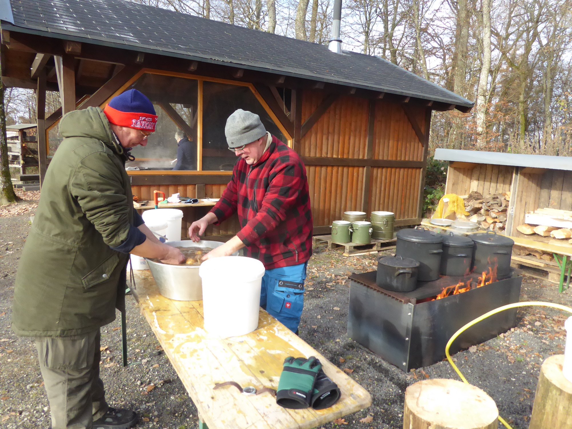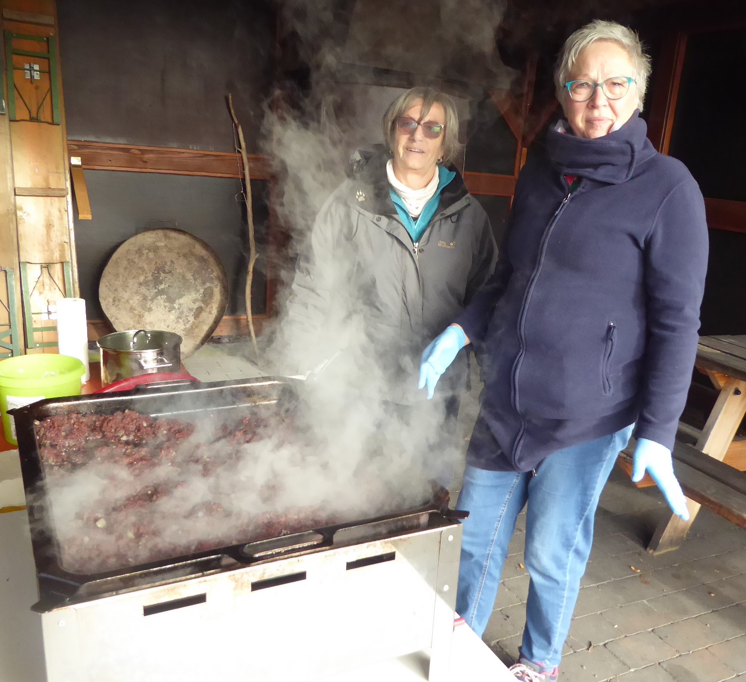 Insgesamt war daher wieder eine stattliche Anzahl von Helferinnen und Helfern notwendig, um diese Veranstaltung in gewohnter Weise optimal vorbereiten und durchführen zu können. Die „Blootwooscht“ wurde in großen Pfannen mit viel Zwiebeln frisch und herzhaft zubereitet. Die Beilage bestand aus „Quellkrumbere“, die in großen Eisentöpfen auf dem Holzfeuer gekocht wurden und dazu gab es „Äppelschmäär“ (Apfelkompott). Ansonsten hatte die Speisekarte auch heiße Fleischwürstchen mit Brötchen anzubieten. Und zum Nachtisch konnten sich die Gäste an einer bunten Auswahl selbstgebackener Kuchen erfreuen. Dazu wurde Glühwein oder ein kühles Bier getrunken. Auch Kaffee und andere Getränke waren natürlich im Angebot.