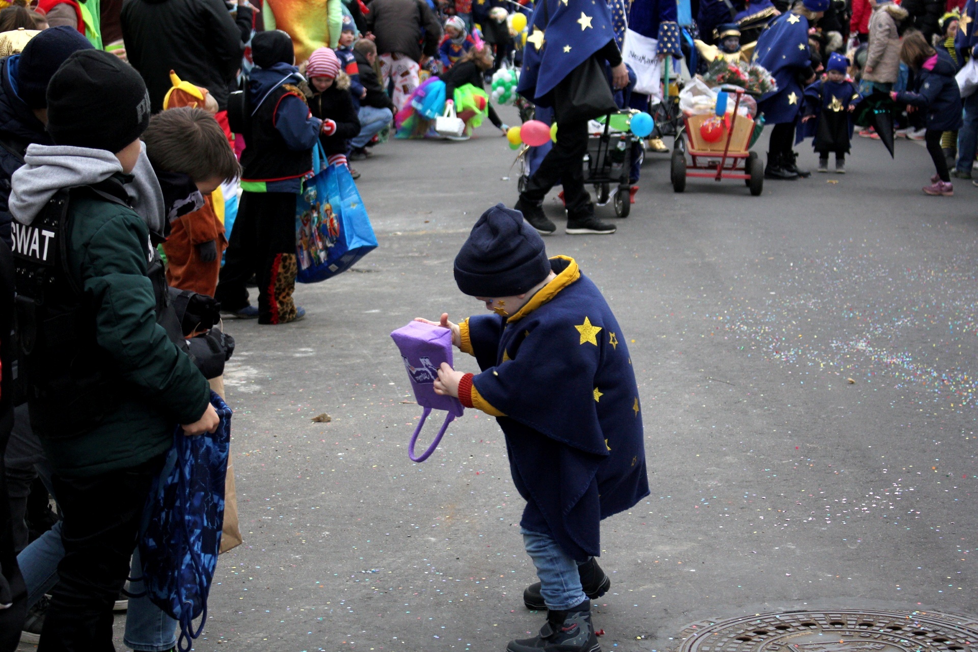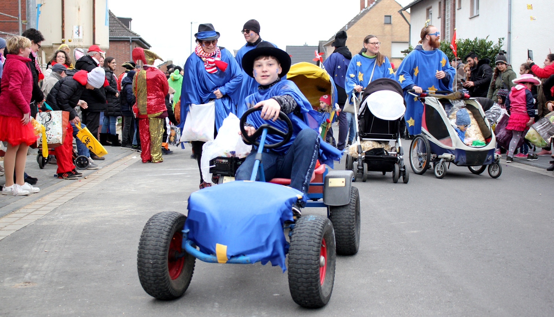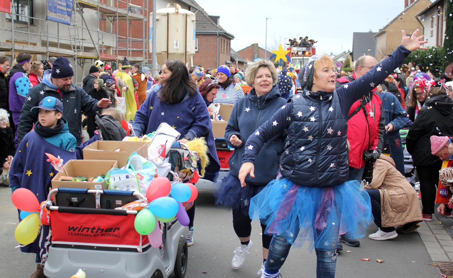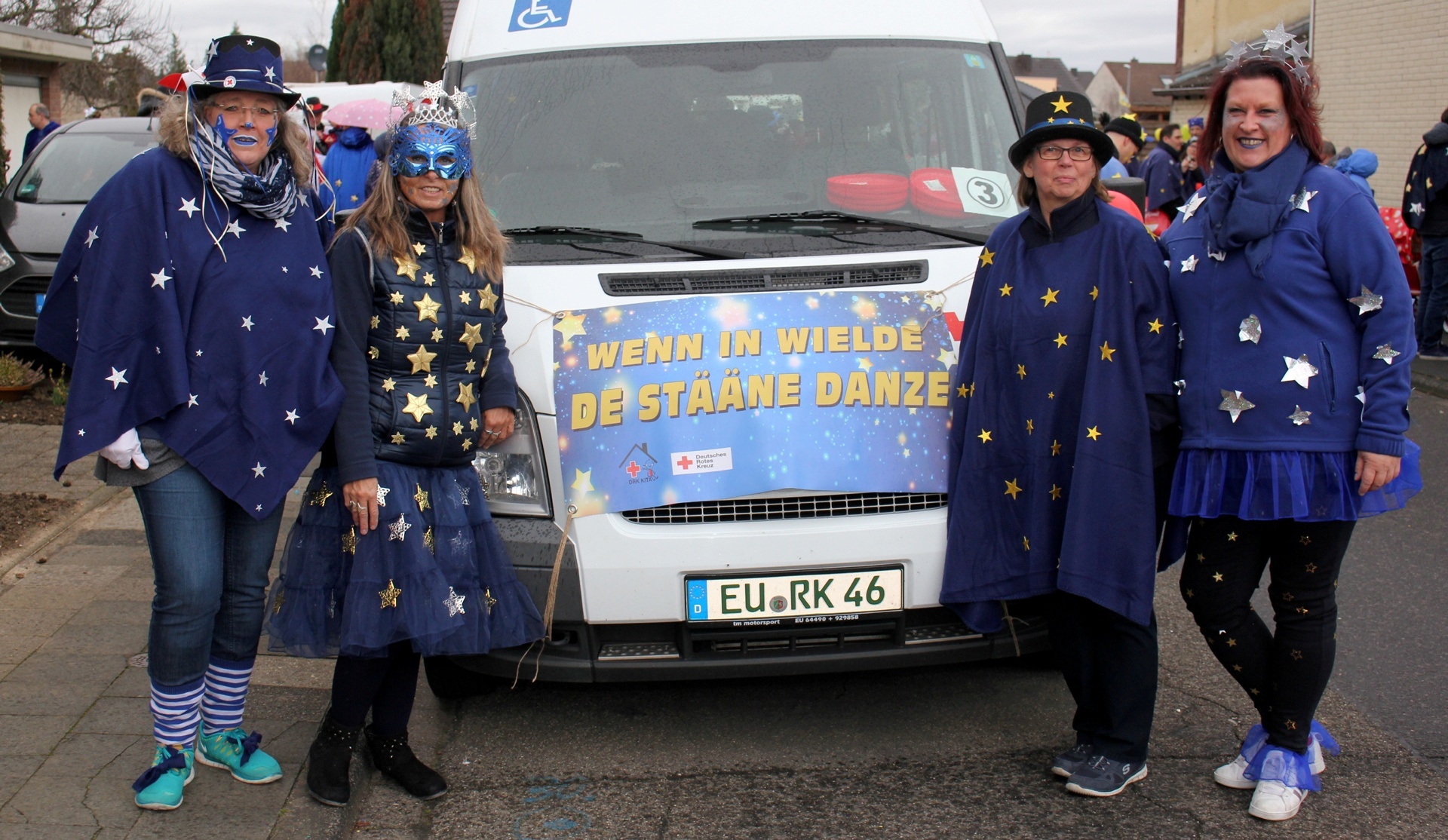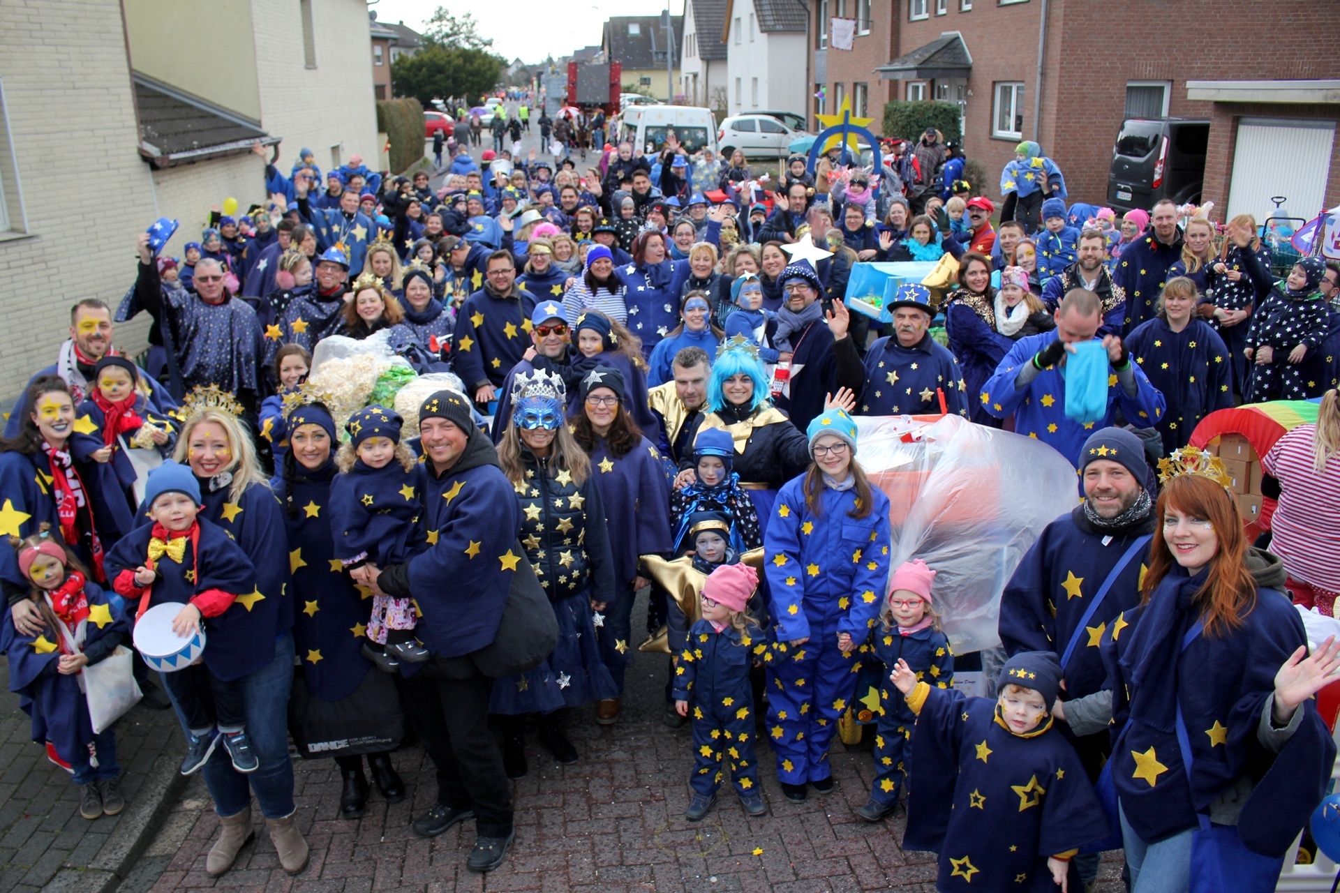 Einer kollektiven Ohnmacht anheimgefallen sind die Weilerswister Jecken bei ihrem Karnevalszug zum Glück nicht. Doch trotzdem sahen sie alle minutenlang Sterne. Der Grund war einfach: Fünf Kindertagesstätten unter der Trägerschaft des Deutschen Roten Kreuzes waren mit sage und schreibe 190 Teilnehmern (Kinder, Eltern und Erzieher-Teams) dabei – das waren noch einmal 60 Personen mehr als im Vorjahr. Die Gruppe war damit sogar größer als die der Gesamtschule, die ansonsten mit den meisten Leuten unterwegs ist. Das Motto lautete diesmal „Wenn in Wielde de Stääne danze“. Passend dazu trugen die Teilnehmer blaue Umhänge mit goldenen Sternen. Darüber hinaus gab es keine exakte Vorgabe, sodass sich die Kostüme alle ein wenig unterschieden. Die Eltern brachten so ganz individuelle Noten in die Kostüme. Manche DRK-Jecke hatte noch Accessoires dabei, etwa Haarreife mit Sternen, auch Hüte und Mützen wurden mit Sternen bestickt. Ein Kind war sogar komplett als Stern verkleidet. Und nicht nur das: Ein Mercedes-Stern an einem der Bollerwagen durfte auch nicht fehlen – nee, wat jeck! „Und wir können nicht nur singen, sondern auch tanzen“, stimmten sich die Leitungen zu. Mit dabei waren die Kita Sonnenblume (Weilerswist), die Kita Regenbogen (Weilerswist II), das Familienzentrum Weilerswist-Süd, die Kita Blumenwiese (Weilerswist-Süd II) und die Kita Spatzennest (Groß-Vernich II). Die jecke Pänz, ihre Eltern und die Kita-Teams machten ordentlich Stimmung und brachten Kamelle unters Volk. Mit Seifenblasen und Konfetti machten sie den wettermäßig grauen Tag auch etwas bunter. Und für die Gesundheit taten die Kitas auch noch etwas: In ihrem Materialwagen, der mitten in der Gruppe fuhr und an dem auch das Motto prangte, hatten sie 1000 Äpfel gestapelt, die verteilt werden mussten. Das Deutsche Rote Kreuz war natürlich nicht nur als Teilnehmer beim Zug. Wie jedes Jahr standen auch Sanitäter bereit, die den Zoch begleiteten und im Fall der Fälle einschreiten konnten.